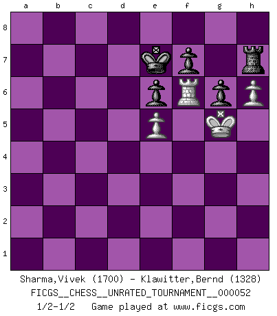 Last move : 1/2-1/2 2018 June 13 18:51:30 [Event "FICGS__CHESS__UNRATED_TOURNAMENT__000052"] [Site "FICGS"] [Date "2018.04.23"] [Round "1"] [White "Sharma,Vivek"] [Black "Klawitter,Bernd"] [Result "1/2-1/2"] [WhiteElo "1700"] [BlackElo "1328"] 1.e4 c6 2.e5 d6 3.d4 d5 4.Nc3 Bf5 5.Bd3 Bxd3 6.Qxd3 e6 7.Nf3 Be7 8.Bf4 Nd7 9.Na4 Qa5+ 10.Nc3 a6 11.O-O Qd8 12.Qe3 h6 13.Na4 Rc8 14.Nc5 Nxc5 15.dxc5 Qa5 16.Qb3 Bxc5 17.Qxb7 Ne7 18.Bd2 Qb5 19.Qxb5 axb5 20.Be3 Bxe3 21.fxe3 Nf5 22.Nd4 Nxe3 23.Rfe1 c5 24.Rxe3 cxd4 25.Rb3 Kd7 26.Rc1 Rc7 27.Rxb5 Rhc8 28.Rf1 Ke8 29.Rf4 Rxc2 30.Rxd4 Rc1+ 31.Kf2 R1c2+ 32.Kf3 Kd7 33.h4 h5 34.Rf4 Kc6 35.a4 Rc7 36.g4 Rc4 37.b3 Rxf4+ 38.Kxf4 hxg4 39.Kxg4 Kd7 40.a5 Kc8 41.b4 Rc4+ 42.Kg5 d4 43.a6 Rc7 44.Rb6 d3 45.Rd6 Kb8 46.Rxd3 Ka7 47.b5 Kb6 48.Rf3 Kxb5 49.h5 Kxa6 50.Rg3 Kb7 51.Kh4 Rc4+ 52.Kh3 g6 53.h6 Rc8 54.Rg4 Rh8 55.Rh4 Rh7 56.Kg4 Kc7 57.Kg5 Kd7 58.Rd4+ Ke7 59.Rf4 Kf8 60.Rf3 Ke7 61.Rf6 Kf8 62.Rf4 Ke7 63.Rf6 Kf8 64.Rf4 Ke7 65.Rf6 1/2-1/2 Caro-Kann defense Kingside Castling by player White (move 11) 10 pieces endgame at move 48 : White KRPPP , Black KRPPP WHITE : King + 1 Rook 3 Pawns BLACK : King + 1 Rook 3 Pawns 9 pieces endgame at move 49 : White KRPP , Black KRPPP WHITE : King + 1 Rook 2 Pawns BLACK : King + 1 Rook 3 Pawns This chess game ended in a draw. Follow this game move after move (download)A good player is always lucky. (Jose Raul Capablanca) Deine Wertungszahl - vorausgesetzt einige Jahre schachliche Anstrengung - entspricht etwa dem zehnfachen Deines IQ plus 1000. (Jonathan Levitt) Por tratar de evitar la pérdida de una pieza, muchas personas han perdido una partida de Ajedrez. (Savielly Tartakover) Le pion, dans sa simplicité, marche droit devant lui, mais lorsqu'il prend, il le fait obliquement? Ainsi l'homme, tant qu'il reste pauvre, marche dans la droiture et vit honnêtement, mais lorsqu'il recherche les honneurs, il flatte, se parjure et, par les voies obliques, cherche une position supérieure sur l'échiquier du monde. (Jean de Galles) We're missing something. (Gregory House, House M.D.)
