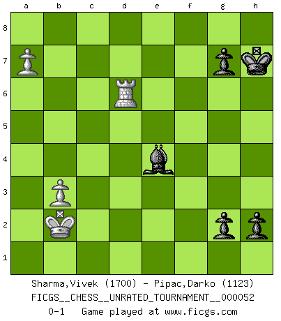 Last move : 0-1 2018 June 6 5:53:42 [Event "FICGS__CHESS__UNRATED_TOURNAMENT__000052"] [Site "FICGS"] [Date "2018.04.23"] [Round "1"] [White "Sharma,Vivek"] [Black "Pipac,Darko"] [Result "0-1"] [WhiteElo "1700"] [BlackElo "1123"] 1.e4 e5 2.d4 exd4 3.Qxd4 Nc6 4.Qd1 Nf6 5.Nc3 Bb4 6.Bg5 h6 7.Bd2 Bxc3 8.Bxc3 O-O 9.Bd3 d5 10.Bxf6 Qxf6 11.exd5 Ne5 12.g3 Ng4 13.Nh3 Ne5 14.f4 Nxd3+ 15.Qxd3 Bxh3 16.O-O-O Rfe8 17.Qb5 b6 18.Rhg1 Bg4 19.Rde1 Qd6 20.Rxe8+ Rxe8 21.Qxe8+ Qf8 22.Qe5 f6 23.Qxc7 Bf3 24.Qxa7 Qc5 25.Re1 Bxd5 26.Re7 Qg1+ 27.Kd2 Qxh2+ 28.Re2 Qxg3 29.Qb8+ Kh7 30.b3 Bf3 31.Re8 Qg2+ 32.Kc3 Be4 33.Rh8+ Kg6 34.Qxb6 Qxc2+ 35.Kb4 Qd2+ 36.Ka3 Qxf4 37.Qg1+ Qg5 38.Qd4 Bb1 39.Kb2 Bf5 40.Rg8 h5 41.Qa7 Qh6 42.a4 h4 43.Qg1+ Qg5 44.Qxg5+ fxg5 45.Rd8 h3 46.Rd2 g4 47.a5 g3 48.a6 h2 49.Rd1 g2 50.a7 Be4 51.Rd6+ Kh7 0-1 Centre game Kingside Castling by player Black (move 8) Queenside Castling by player White (move 16) 10 pieces endgame at move 44 : White KQRPP , Black KBPPP WHITE : King + 1 Queen 1 Rook 2 Pawns BLACK : King + 1 Bishop 3 Pawns 9 pieces endgame at move 44 : White KRPP , Black KBPPP WHITE : King + 1 Rook 2 Pawns BLACK : King + 1 Bishop 3 Pawns Player Black won this chess game. Follow this game move after move (download)When I asked Fischer why he had not played a certain move in our game, he replied: 'Well, you laughed when I wrote it down !' (Mikhail Tal) Ich spiele ehrlich und spiele, um zu gewinnen. Wenn ich verliere nehme ich meine Medizin. (Robert James Fischer) El Ajedrez detiene a su maestro dentro de sus propios vínculos, encadenando la mente y el cerebro, por lo que la libertad interior del mas fuerte debe sufrir. (Albert Einstein) J'ai vu le vaincu d'Echecs jouer des années durant dans l'espoir de la fête de la victoire. Car tu es plus riche de ce qu'elle existe si même elle n'est point pour toi. Ainsi de la perle du fond des mers. (Antoine de Saint-Exupéry) Without deviation from the norm, progress is not possible. (Frank Zappa)