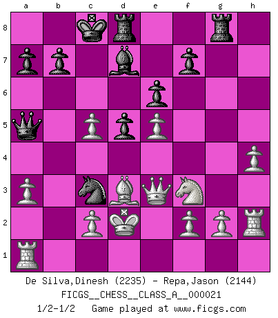 Last move : 1/2-1/2 2007 October 5 7:57:54 [Event "FICGS__CHESS__CLASS_A__000021"] [Site "FICGS"] [Date "2007.05.02"] [Round "1"] [White "De Silva,Dinesh"] [Black "Repa,Jason"] [Result "1/2-1/2"] [WhiteElo "2235"] [BlackElo "2144"] 1.e4 e6 2.d4 d5 3.Nc3 Nf6 4.Bg5 Bb4 5.e5 h6 6.Bd2 Bxc3 7.bxc3 Ne4 8.Qg4 g6 9.Bd3 Nxd2 10.Kxd2 c5 11.h4 Qa5 12.Nf3 Nd7 13.Bxg6 Nb6 14.Qh5 Rf8 15.Bd3 Bd7 16.Qxh6 O-O-O 17.Qe3 Na4 18.dxc5 Nxc3 19.a3 Rg8 20.Rh2 1/2-1/2 French : MacCutcheon, Lasker variation Queenside Castling by player Black (move 16) This chess game ended in a draw. Follow this game move after move (download)The beauty of a move lies not in its' appearance but in the thought behind it. (Siegbert Tarrasch) Rauchen ist dem Schachspieler bei seiner Arbeit, also im Wettkampf, untersagt. (Viktor Kortschnoi) Fischer es una tragedia del Ajedrez Americano a la par con Morphy y Pillsbury. (Mig Greengard) Dieu déplace le joueur, et celui-ci la pièce. Quel Dieu derrière Dieu commence donc la trame ? Arturo Perez-Reverte (prix de littérature policière 1993). No, I am still playing. (Anatoly Karpov)