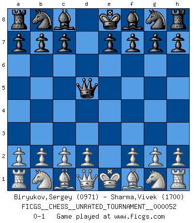Last move : 0-1 2018 June 3 0:45:49 [Event "FICGS__CHESS__UNRATED_TOURNAMENT__000052"] [Site "FICGS"] [Date "2018.04.23"] [Round "1"] [White "Biryukov,Sergey"] [Black "Sharma,Vivek"] [Result "0-1"] [WhiteElo "0971"] [BlackElo "1700"] 1.e4 d5 2.exd5 Qxd5 0-1 This chess game has been lost on time (started : 2018.04.23 11:51:36) Scandinavian (centre counter) defense Player Black won this chess game. Follow this game move after move (download)One of these modest little moves may be more embarrassing to your opponent than the biggest threat. (Siegbert Tarrasch) Die meiste Zeit treffe ich auf Gegner, die meine Enkel sein könnten. Ich bin da, um ihnen zu zeigen, dass sie von mir noch einiges lernen können. (Viktor Kortschnoi) Vive, pierde y aprende al observar a tu oponente como ganar. (Amber Steenbock) Il vaut mieux sacrifier les pièces de l'adversaire. (Xavier Tartacover) If passion drives you, let reason holds the reins. (Benjamin Franklin)
