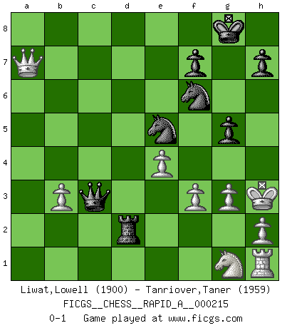 Last move : 0-1 2018 June 20 12:54:26 [Event "FICGS__CHESS__RAPID_A__000215"] [Site "FICGS"] [Date "2018.04.24"] [Round "1"] [White "Liwat,Lowell"] [Black "Tanriover,Taner"] [Result "0-1"] [WhiteElo "1900"] [BlackElo "1959"] 1.d4 d5 2.c4 c6 3.Nc3 Nf6 4.f3 dxc4 5.a4 Qc7 6.e4 e5 7.Bxc4 exd4 8.Qxd4 Bd6 9.g3 Nbd7 10.Be3 O-O 11.O-O-O Bc5 12.Qd2 Bxe3 13.Qxe3 b5 14.axb5 cxb5 15.Bxb5 Rb8 16.Ba4 Ne5 17.b3 Bd7 18.Kd2 Bxa4 19.Nxa4 Rfd8+ 20.Ke1 Rxd1+ 21.Kxd1 Rd8+ 22.Ke1 Qc2 23.Nc3 Rd3 24.Qxa7 Qxc3+ 25.Kf1 Rd1+ 26.Kg2 Rd2+ 27.Kh3 g5 0-1 QGD Slav defense Kingside Castling by player Black (move 10) Queenside Castling by player White (move 11) Player Black won this chess game. Follow this game move after move (download)The stomach is an essential part of the Chess master. (Bent Larsen) Drei Punkte vor allen anderen ist wie einer, der im weißen Anzug posiert, während der Rest in Müllsäcke gekleidet dasteht. (Viktor Kortschnoi) En el Ajedrez, tal como es jugado por los Maestros, practicamente la suerte es eliminada. (Emanuel Lasker) Il n'y a pas eu de défaite parce que je ne crois pas que cet ordinateur ait jamais existé. IBM a triché en refusant d'imprimer les modes de recherche de la machine. C'est évident, pendant le match, des coups décisifs ont été joués par des êtres humains. Aujourd'hui, les meilleurs spécialistes en informatique ne peuvent toujours pas expliquer comment Deep-Blue a pu jouer contre la logique des ordinateurs. IBM a gagné une guerre de communication, mais ils sont incapables de prouver que l'ordinateur a gagné tout seul. (Garry Kasparov) The greatest con, that he ever pulled... was making you believe... that he is you. (Revolver, movie)