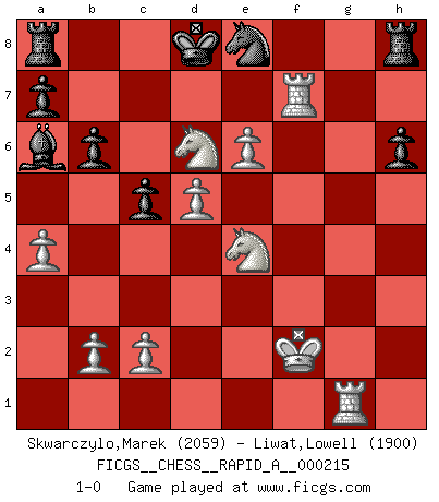 Last move : 1-0 2018 April 27 14:58:24 [Event "FICGS__CHESS__RAPID_A__000215"] [Site "FICGS"] [Date "2018.04.24"] [Round "1"] [White "Skwarczylo,Marek"] [Black "Liwat,Lowell"] [Result "1-0"] [WhiteElo "2059"] [BlackElo "1900"] 1.d4 c5 2.d5 e5 3.e4 d6 4.Nc3 Be7 5.Nf3 h6 6.Nd2 g5 7.Nc4 Na6 8.Be2 Nc7 9.a4 f5 10.h4 f4 11.hxg5 Bxg5 12.g3 fxg3 13.Bxg5 gxf2+ 14.Kxf2 Qxg5 15.Nxd6+ Kf8 16.Bh5 Nf6 17.Qf3 Qf4 18.Qxf4 exf4 19.Bf3 Ng4+ 20.Bxg4 Bxg4 21.Rag1 Bc8 22.Rh4 Ke7 23.e5 Ne8 24.Nce4 b6 25.Rxf4 Ba6 26.Rf7+ Kd8 27.e6 1-0 Semi-Benoni (`blockade variation') Player White won this chess game. Follow this game move after move (download)The passion for playing Chess is one of the most unaccountable in the world. (H.G. Wells) Ein Gewinn durch eine ungenaue Kombination, sei sie auch noch so vorzeigbar, erfüllt mich mit Schaudern. (Wilhelm Steinitz) El jugador blanco perdió porque fallo en recordar la coreccta continuación y tuvo que pensar por sí mismo las movidas. (Siegbert Tarrasch) Celui qui prend des risques peut perdre, celui qui n'en prend pas perd toujours. (Xavier Tartacover) All maxims have their antagonist maxims; proverbs should be sold in pairs, a single one being but a half truth. (William Mathews)