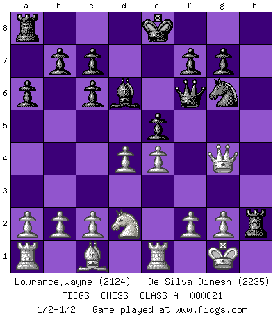 Last move : 1/2-1/2 2007 July 10 6:45:3 [Event "FICGS__CHESS__CLASS_A__000021"] [Site "FICGS"] [Date "2007.05.02"] [Round "1"] [White "Lowrance,Wayne"] [Black "De Silva,Dinesh"] [Result "1/2-1/2"] [WhiteElo "2124"] [BlackElo "2235"] 1.e4 e5 2.Nf3 Nc6 3.Bb5 a6 4.Bxc6 dxc6 5.O-O Bg4 6.h3 h5 7.d3 Qf6 8.Nbd2 Ne7 9.Re1 Ng6 10.d4 Bd6 11.hxg4 hxg4 12.Nh2 Rxh2 13.Qxg4 1/2-1/2 Ruy Lopez : Exchange variation, Alapin gambit Kingside Castling by player White (move 5) This chess game ended in a draw. Follow this game move after move (download)In Fischer's hands, a slight theoretical advantage is as good a being a Queen ahead. (Isaac Kashdan) Der Umstand, daß uns eine 7 Stunden Zeitkontrolle ermöglicht eine großartige, tiefe Partie zu spielen, ist für die Massenmedien nicht weiter von Bedeutung. (Alexej Shirov) El Ajedrez es el arte del análisis. (Mikhail Botvinnik) Le temps de noter son nom sur la feuille de partie, j'étais déjà en zeitnot ! D'un modeste amateur apparié lors de la première ronde d'un open contre le grand-maître Azmaïparashvili. I don't diet. I just don't eat as much as I'd like to. (Linda Evangelista, supermodel)