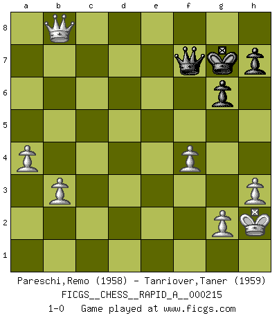Last move : 1-0 2018 October 11 1:38:55 [Event "FICGS__CHESS__RAPID_A__000215"] [Site "FICGS"] [Date "2018.04.24"] [Round "1"] [White "Pareschi,Remo"] [Black "Tanriover,Taner"] [Result "1-0"] [WhiteElo "1958"] [BlackElo "1959"] 1.d4 Nf6 2.c4 g6 3.Nc3 d5 4.Nf3 Bg7 5.Qb3 dxc4 6.Qxc4 O-O 7.e4 Nbd7 8.Be2 c6 9.O-O e5 10.dxe5 Ng4 11.e6 Nde5 12.exf7+ Rxf7 13.Nxe5 Nxe5 14.Qb3 Qe7 15.Be3 Be6 16.Qc2 Nc4 17.Bxc4 Bxc4 18.Rfd1 Qe6 19.Bd4 Bf8 20.f3 Bd6 21.b3 Ba6 22.e5 Bxe5 23.Ne4 Raf8 24.Qc3 Rf5 25.Rac1 Bf4 26.Re1 c5 27.Bh8 Qf7 28.Rcd1 Bb5 29.Nd6 Bxd6 30.Rxd6 Rc8 31.h3 Qf8 32.Be5 Rd8 33.Red1 Re8 34.f4 Bc6 35.Qg3 Qh6 36.R1d2 a6 37.Kh2 Rf7 38.Rc2 Qf8 39.Qh4 Be4 40.Rxc5 Bf5 41.Rcd5 Rc7 42.Bb2 Rc2 43.Rf6 Qe7 44.Rdxf5 Rxb2 45.Re5 Qd8 46.Qg5 Kg7 47.Rxe8 Qxe8 48.Rb6 Rd2 49.Rxb7+ Kg8 50.Rb6 Qa8 51.a4 a5 52.Rb5 Qf8 53.Qe5 Rd8 54.Rxa5 Qg7 55.Ra8 Rxa8 56.Qd5+ Qf7 57.Qxa8+ Kg7 58.Qb8 1-0 Taner Tanriover Thanks for the game. I hope to play white against you some day. King's Indian defense, 3.Nc3 Kingside Castling by player Black (move 6) Kingside Castling by player White (move 9) Player White won this chess game. Follow this game move after move (download)Any material change in a position must come about by mate, a capture, or a Pawn promotion. (Purdy) Die meiste Zeit treffe ich auf Gegner, die meine Enkel sein könnten. Ich bin da, um ihnen zu zeigen, dass sie von mir noch einiges lernen können. (Viktor Kortschnoi) Un mal plan es mejor que no tener ningún plan. (Frank Marshall) Les échecs c'est le défi de l'alpiniste, toujours plus haut, prêt à tout pour monter à l'assaut du Roi ennemi. Les échecs, c'est de la musique en mouvement, un ballet majestueux pour les yeux. C'est de la poésie composée par les fantômes du passé qui au même titre que Rimbaud ou Verlaine méritent notre admiration. Les échecs, c'est de la peinture ou le moindre mouvement modifie le tableau pour en faire un Picasso ou un Van Gogh. Les échecs, c'est tout et rien, c'est la vie et la mort. Jjulie33 sur le forum de France-Echecs. They misunderestimated me. (George W. Bush, Bentonville nov. 6, 2000)