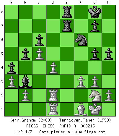 Last move : 1/2-1/2 2018 July 29 4:44:11 [Event "FICGS__CHESS__RAPID_A__000215"] [Site "FICGS"] [Date "2018.04.24"] [Round "1"] [White "Kerr,Graham"] [Black "Tanriover,Taner"] [Result "1/2-1/2"] [WhiteElo "2000"] [BlackElo "1959"] 1.e4 e5 2.Nf3 Nc6 3.Bb5 a6 4.Ba4 Nf6 5.O-O Be7 6.Re1 b5 7.Bb3 O-O 8.c3 d5 9.exd5 Nxd5 10.Nxe5 Nxe5 11.Rxe5 c6 12.Re1 Bd6 13.d4 Qh4 14.g3 Qh3 15.Qe2 Bd7 16.Qf1 Qf5 17.c4 Nf6 18.c5 Bc7 19.Nc3 a5 20.Nd1 Rfe8 21.Ne3 Qe4 22.Rd1 Qg6 23.Bc2 Qh5 24.Re1 a4 25.Bd1 Qg6 26.Bf3 Ba5 27.Rd1 Ne4 28.Qd3 h5 29.Bg2 Re7 30.f3 Nf6 31.Bf1 Rae8 32.Qxg6 fxg6 33.Ng2 Bf5 34.Bd2 Bxd2 35.Rxd2 g5 36.Rad1 Be6 37.a3 Bb3 1/2-1/2 Ruy Lopez : Closed, 7...O-O Kingside Castling by player White (move 5) Kingside Castling by player Black (move 7) This chess game ended in a draw. Follow this game move after move (download)Chess, like any creative activity, can exist only through the combined efforts of those who have creative talent, and those who have the ability to organize their creative work. (Mikhail Botvinnik) Wenn du nicht weißt was du tun sollst, warte bis dein Gegner eine Idee hat. Sie wird sicher schlecht sein. (Siegbert Tarrasch) En la vida, como en el Ajedrez, los Peones propios obstruyen nuestro camino. La gran fortuna de un hombre, su comodidad, placer, hijos, libros, que deberían ayudarle a ganar, con mucha frecuencia lo ponen en Jaque Mate. (Charles Buxton) Les échecs, c'est la lutte contre l'erreur. (Johannes Zukertort) Chess, like love, like music, has the power to make people happy. (Siegbert Tarrasch)