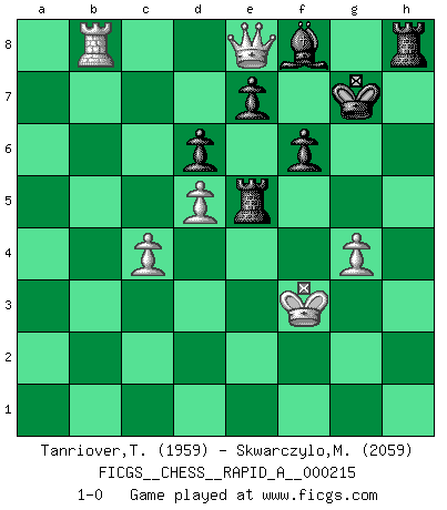 Last move : 1-0 2018 October 1 11:17:17 [Event "FICGS__CHESS__RAPID_A__000215"] [Site "FICGS"] [Date "2018.04.24"] [Round "1"] [White "Tanriover,Taner"] [Black "Skwarczylo,Marek"] [Result "1-0"] [WhiteElo "1959"] [BlackElo "2059"] 1.e4 c5 2.Nf3 Nc6 3.d4 cxd4 4.Bc4 g6 5.Nxd4 Bg7 6.Be3 Nf6 7.Nc3 O-O 8.Bb3 Re8 9.O-O d6 10.h3 Na5 11.f4 Nxb3 12.axb3 a6 13.f5 Bd7 14.Qd3 b5 15.Nd5 Qb8 16.c4 Qb7 17.Rf2 bxc4 18.bxc4 a5 19.fxg6 hxg6 20.Bg5 Nxd5 21.exd5 Qb6 22.Be3 Qb4 23.Raf1 Rf8 24.h4 Rac8 25.Rc1 a4 26.h5 gxh5 27.Nf5 Bxf5 28.Rxf5 Rc7 29.Rg5 f6 30.Rg6 Rf7 31.Qe2 Rb7 32.Bd4 a3 33.bxa3 Qxa3 34.Ra1 Qxa1+ 35.Bxa1 Rb1+ 36.Kh2 Rxa1 37.Rg3 Rc1 38.Ra3 Bf8 39.Ra8 Rc3 40.Rc8 Rg7 41.Qe6+ Rf7 42.Qe1 Rd3 43.Qe2 Rd4 44.Qxh5 Rg7 45.Qe2 Rh7+ 46.Kg1 Kg7 47.Qc2 Rh5 48.Qa4 Rd2 49.Qe8 Rh8 50.Rb8 Rd1+ 51.Kf2 Rd2+ 52.Kf3 Rd4 53.Qc8 Rd3+ 54.Ke2 Rd4 55.Ke3 Rdh4 56.g3 R4h5 57.Kf3 Re5 58.Qg4+ Kf7 59.Qd7 Kg6 60.Qe8+ Kg7 61.g4 1-0 Sicilian defense Kingside Castling by player Black (move 7) Kingside Castling by player White (move 9) Player White won this chess game. Follow this game move after move (download)Chess is a foolish expedient for making idle people believe they are doing something very clever when they are only wasting their time. (George Bernard Shaw) Ich tröste mich mit dem Vergnügen, daß Schachfans, Zuschauer und Leser glücklich sind, wenn ein Großmeister etwas riskiert, statt nur Klötzchen zu schieben. (Mikhail Nekhemyevich Tal) Las Aperturas te enseñan aperturas. ¡Los Finales te enseñan Ajedrez!. (Stephan Gerzadowicz) À la honte des hommes, on sait que les lois du jeu sont les seules qui soient partout justes, claires, inviolables et exécutées. Pourquoi l'Indien qui a donné les règles du jeu d'échecs est-il obéi de bon gré dans toute la terre, et que les décrétales des papes, par exemple, sont aujourd'hui un objet d'horreur et de mépris ? C'est que l'inventeur des échecs combina tout avec justesse pour la satisfaction des joueurs, et que les papes, dans leurs décrétales, n'eurent en vue que leur seul avantage. L'Indien voulut exercer également l'esprit des hommes et leur donner du plaisir; les papes ont voulu abrutir l'esprit des hommes. Voltaire (Dictionnaire philosophique / Garnier 1967) Wisdom doesn't necessarily come with age. Sometimes age just shows up all by itself. (Tom Wilson)