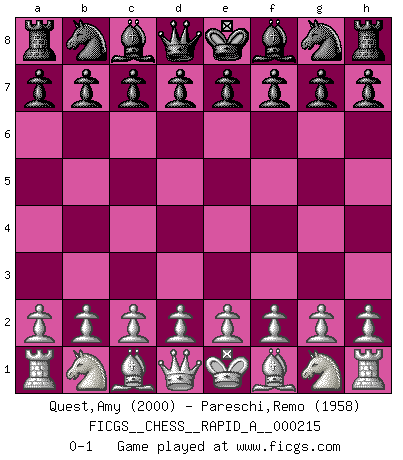 Last move : 0-1 2018 May 24 11:53:12 [Event "FICGS__CHESS__RAPID_A__000215"] [Site "FICGS"] [Date "2018.04.24"] [Round "1"] [White "Quest,Amy"] [Black "Pareschi,Remo"] [Result "0-1"] [WhiteElo "2000"] [BlackElo "1958"] 0-1 This chess game has been lost on time (started : 2018.04.24 9:1:9) Player Black won this chess game. Follow this game move after move (download)Bobby Fischer is the greatest Chess genius of all time ! (Alexander Kotov) Alle Schachspieler sollten auch ein Hobby haben. (Savielly Grigorievitsch Tartakower) El Ajedrez no es una pizca de inferior al violín, y tenemos un gran número de violinistas profesionales. (Mikhail Botvinnik) Les sacrifices démontrent seulement que quelqu'un a gaffé. (Savielly Tartacover) You can't play chess if you're groggy from pills. (Anatoly Karpov)