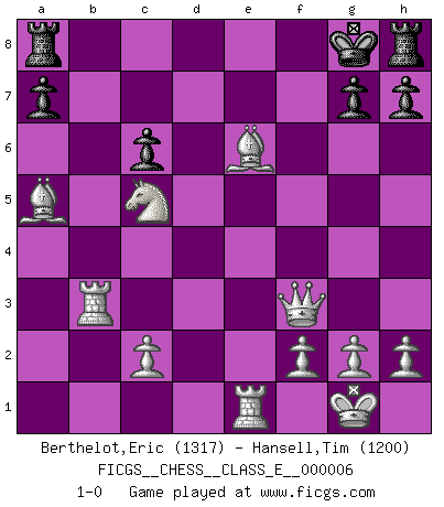 Last move : 1-0 2006 July 19 14:17:58 [Event "FICGS__CHESS__CLASS_E__000006"] [Site "FICGS"] [Date "2006.06.07"] [Round "1"] [White "Berthelot,Eric"] [Black "Hansell,Tim"] [Result "1-0"] [WhiteElo "1317"] [BlackElo "1200"] 1.e4 c5 2.Nf3 Nc6 3.d4 Qa5+ 4.Bd2 Qb6 5.d5 d6 6.dxc6 Qxb2 7.Nc3 bxc6 8.Be2 Bg4 9.O-O f5 10.Rb1 Qa3 11.exf5 Bxf5 12.Nh4 d5 13.Nxf5 d4 14.Rb3 Qa5 15.Ne4 Qxa2 16.Nxc5 d3 17.Bxd3 e6 18.Ng3 Bxc5 19.Bc4 Nf6 20.Bxe6 Ne4 21.Nxe4 Qa6 22.Nxc5 Qa5 23.Bd7+ Kd8 24.Bxa5+ Ke7 25.Re1+ Kf7 26.Qf3+ Kg8 27.Be6+ 1-0 Sicilian defense Kingside Castling by player White (move 9) Player White won this chess game. Follow this game move after move (download)I thought the most common mistake [in chess] was the first one: Learning the game :P (Garvin Gray, FICGS forum) Ja, ich habe einmal eine Blitzpartie gespielt, es war in einem Zug, 1929. --im Interview 1989 (Mikhail Moiseyevich Botvinik) El Ajedrez moderno está demasiado preocupado con cosas como la estructura de Peones. Olvidenlo, el Jaque Mate termina la partida. (Nigel Short) On entre au jeu d'Echecs comme on entre en Religion. Pour le joueur d'Echecs, la partie d'Echecs c'est l'office, la messe, le défilé du 1er Mai, le dépôt de gerbe au Monument aux Morts. C'est un drame sacré. (Michel Roos) When you don't know what to do, walk fast and look worried. (Anonymous)