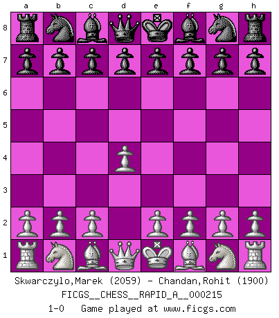 Last move : 1-0 2018 May 24 11:53:12 [Event "FICGS__CHESS__RAPID_A__000215"] [Site "FICGS"] [Date "2018.04.24"] [Round "1"] [White "Skwarczylo,Marek"] [Black "Chandan,Rohit"] [Result "1-0"] [WhiteElo "2059"] [BlackElo "1900"] 1.d4 1-0 This chess game has been lost on time (started : 2018.04.24 9:1:9) Queen's pawn Player White won this chess game. Follow this game move after move (download)You know you're going to lose. Even when I was ahead I knew I was going to lose. - On playing against Fischer. (Andrew Soltis) Ich bin es gewohnt, das die Jugend mir überhaupt keinen Respekt entgegenbringt. (Alexander Morozewich) EL Ajedrez es como la vida. (Boris Spassky) Aux échecs, l'amour-propre est satisfait quand on remporte la victoire, mais il n'y a pas de honte à être battu. (Benjamin Franklin) For peace of mind, resign as general manager of the universe. (Douglas Adams)