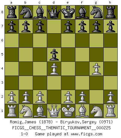 Last move : 1-0 2018 June 6 1:5:14 [Event "FICGS__CHESS__THEMATIC_TOURNAMENT__000225"] [Site "FICGS"] [Date "2018.04.26"] [Round "1"] [White "Romig,James"] [Black "Biryukov,Sergey"] [Result "1-0"] [WhiteElo "1878"] [BlackElo "0971"] 1.d4 d5 2.g4 1-0 This chess game has been lost on time (started : 2018.04.26 18:41:52) Queen's pawn game Player White won this chess game. Follow this game move after move (download)Weak points or holes in the opponent's position must be occupied by pieces not Pawns. (Siegbert Tarrasch) Zum Sieg gelangt man nicht, wenn man gut, sondern nur wenn man besser spielt (Savielly Grigorievitsch Tartakower) El Ajedrez es un mar en el cual un mosquito puede beber y un elefante puede bañarse. (Refrán Hindú) Ne tendez aucun piège pour le plaisir ! Ne jouez rien dans l'espoir que l'adversaire réagisse de façon stupide ! Prenez toujours pour acquis que l'adversaire va trouver le meilleur coup ! Ne jouez jamais de coup dans l'espoir que l'adversaire ne voie pas la menace ! Chacun de vos coups doit améliorer la position d'une façon ou d'une autre. Whenever people agree with me, I always feel I must be wrong. (Oscar Wilde)