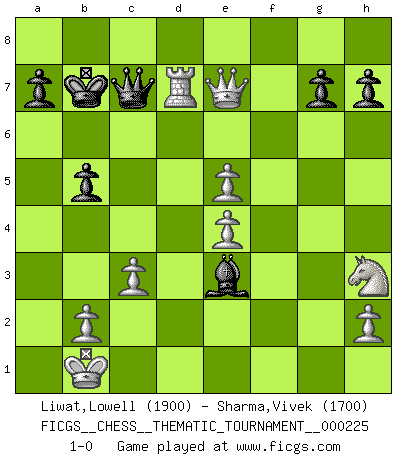 Last move : 1-0 2018 May 2 15:40:40 [Event "FICGS__CHESS__THEMATIC_TOURNAMENT__000225"] [Site "FICGS"] [Date "2018.04.26"] [Round "1"] [White "Liwat,Lowell"] [Black "Sharma,Vivek"] [Result "1-0"] [WhiteElo "1900"] [BlackElo "1700"] 1.d4 d5 2.g4 Bxg4 3.f3 Be6 4.Bf4 Nc6 5.Nc3 Bf5 6.e4 Bg6 7.Nxd5 Rc8 8.Qd2 e6 9.Nxc7+ Rxc7 10.Bxc7 Qxc7 11.O-O-O Nb4 12.a3 Qa5 13.Kb1 f5 14.axb4 Bxb4 15.Qe3 e5 16.dxe5 fxe4 17.Qb3 Bf7 18.Bc4 Bxc4 19.Qxc4 Ne7 20.c3 Bc5 21.fxe4 Rf8 22.Nh3 Be3 23.Rhf1 b5 24.Rxf8+ Kxf8 25.Rf1+ Ke8 26.Qf7+ Kd8 27.Rd1+ Kc8 28.Qe8+ Kb7 29.Qxe7+ Qc7 30.Rd7 1-0 Queen's pawn game Queenside Castling by player White (move 11) Player White won this chess game. Follow this game move after move (download)Castle early and often. (Rob Sillars) Frage: Gibt es etwas was Sie mehr lieben als Autobahnen ohne Tempobegrenzungen? - Antwort: Deutsche Frauen ohne Tempobegrenzungen. (Loek van Wely) Jugadores de primera clase pierden en contra de jugadores de segunda clase porque los jugadores de segunda clase a veces juegan una partida de primer clase. (Siegbert Tarrasch) Les Echecs sont et restent toujours un combat, un combat intégral comme la boxe, la lutte ou un autre sport, et où il doit y avoir un vainqueur et un vaincu. (Joseph Emil Diemer) I would love to change the world, but they won't give me the source code. (Unknown)