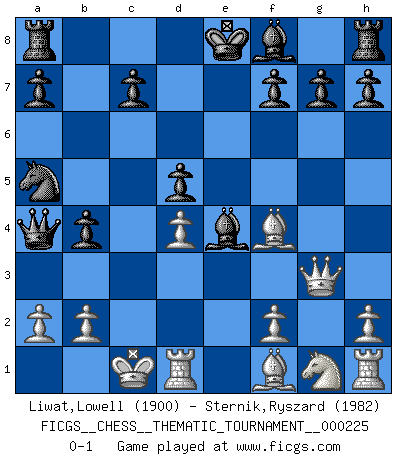 Last move : 0-1 2018 May 4 1:17:14 [Event "FICGS__CHESS__THEMATIC_TOURNAMENT__000225"] [Site "FICGS"] [Date "2018.04.26"] [Round "1"] [White "Liwat,Lowell"] [Black "Sternik,Ryszard"] [Result "0-1"] [WhiteElo "1900"] [BlackElo "1982"] 1.d4 d5 2.g4 Bxg4 3.c4 e6 4.Nc3 dxc4 5.Qa4+ Qd7 6.Qxc4 Nc6 7.Be3 Nge7 8.O-O-O Nd5 9.Nxd5 exd5 10.Qa4 b5 11.Qb3 Bf5 12.Bf4 Na5 13.Qc3 b4 14.Qg3 Qa4 15.e4 Bxe4 0-1 Queen's pawn game Queenside Castling by player White (move 8) Player Black won this chess game. Follow this game move after move (download)Chess is a fairy tale of 1001 blunders. (Savielly Tartakower) Wie bekannt hörte Morphy 1859 auf, Schach zu spielen. Seine Enttäuschung galt nicht so sehr dem Schach, wie den Schachspielern. (Robert James Fischer) Diferente gente reacciona diferentemente en aceptar la derrota. (Bobby Fischer) Les Echecs mettent en conflit, non pas deux intelligences, mais deux volontés. (Lasker) When you don't know what to do, walk fast and look worried. (Anonymous)