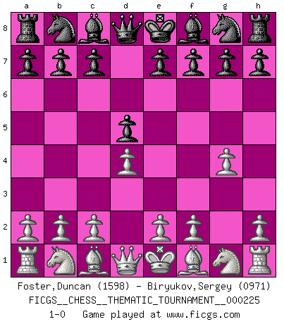 Last move : 1-0 2018 June 6 1:5:14 [Event "FICGS__CHESS__THEMATIC_TOURNAMENT__000225"] [Site "FICGS"] [Date "2018.04.26"] [Round "1"] [White "Foster,Duncan"] [Black "Biryukov,Sergey"] [Result "1-0"] [WhiteElo "1598"] [BlackElo "0971"] 1.d4 d5 2.g4 1-0 This chess game has been lost on time (started : 2018.04.26 18:41:52) Queen's pawn game Player White won this chess game. Follow this game move after move (download)Not only will I predict his triumph over Botvinnik, but I'll go further and say that he'll probably be the greatest Chess player that ever lived. (John Collins) Spiel ein langweiliges Spiel zu Ende und lustige Dinge können passieren. (Hans Ree) Si yo gano un torneo, yo lo gano por mí mismo. Yo hago las jugadas. Nadie me ayuda. (Bobby Fischer) Même si vous avez un bon coup à faire, regardez toujours s'il n'y en a pas un qui lui soit préférable. (Pedro Damiano) A good teacher is like a candle - it consumes itself to light the way for others. (Author unknown)