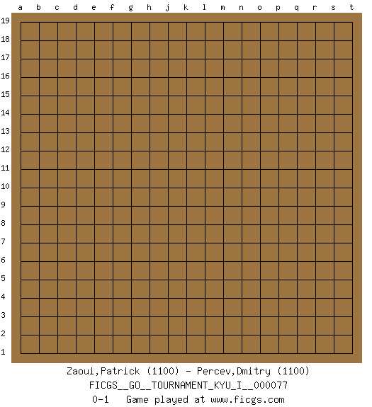 Last move : 0-1 2018 May 27 12:18:27 [Event "FICGS__GO__TOURNAMENT_KYU_I__000077"] [Site "FICGS"] [Date "2018.04.27"] [Round "1"] [Black "Zaoui,Patrick"] [White "Percev,Dmitry"] [Result "0-1"] [Rating 1 "1100"] [Rating 2 "1100"] 0-1 This go game has been lost on time (started : 2018.04.27 11:52:37) Here are the names of the openings (joseki) played in the four corners : Player White won this Go (weiqi, baduk) game. Follow this game move after move (download)Keep away from thickness. (Anonymous) We need strong personalities and only one world champion to attract sponsors. (Anatoly Karpov)