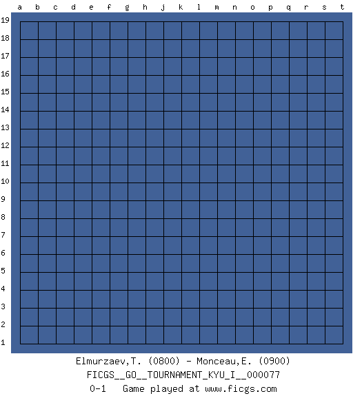 Last move : 0-1 2018 May 27 12:18:27 [Event "FICGS__GO__TOURNAMENT_KYU_I__000077"] [Site "FICGS"] [Date "2018.04.27"] [Round "1"] [Black "Elmurzaev,Turpal"] [White "Monceau,Etienne"] [Result "0-1"] [Rating 1 "0800"] [Rating 2 "0900"] 0-1 This go game has been lost on time (started : 2018.04.27 11:52:37) Here are the names of the openings (joseki) played in the four corners : Player White won this Go (weiqi, baduk) game. Follow this game move after move (download)Strike at the waist of the knight's move. (Anonymous) Luck has a peculiar habit of favoring those who don't depend on it. (Author unknown)