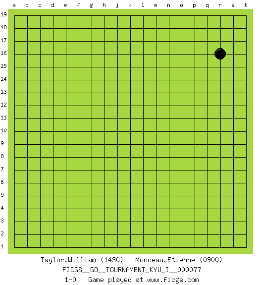 Last move : 1-0 2018 May 27 12:18:27 [Event "FICGS__GO__TOURNAMENT_KYU_I__000077"] [Site "FICGS"] [Date "2018.04.27"] [Round "1"] [Black "Taylor,William"] [White "Monceau,Etienne"] [Result "1-0"] [Rating 1 "1430"] [Rating 2 "0900"] 1.r16 1-0 This go game has been lost on time (started : 2018.04.27 11:52:37) Here are the names of the openings (joseki) played in the four corners : Player Black won this Go (weiqi, baduk) game. Follow this game move after move (download)If a formation is symmetrical, play at the center. (Anonymous) Some people are so afraid to die that they never begin to live. (Henry Van Dyke)