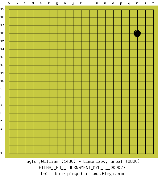 Last move : 1-0 2018 May 27 12:18:27 [Event "FICGS__GO__TOURNAMENT_KYU_I__000077"] [Site "FICGS"] [Date "2018.04.27"] [Round "1"] [Black "Taylor,William"] [White "Elmurzaev,Turpal"] [Result "1-0"] [Rating 1 "1430"] [Rating 2 "0800"] 1.r16 1-0 This go game has been lost on time (started : 2018.04.27 11:52:37) Here are the names of the openings (joseki) played in the four corners : Player Black won this Go (weiqi, baduk) game. Follow this game move after move (download)Always remember, keep the balance. [between territory and influence] (Figaro) The problem with manipulation is that people can turn on you. (Horatio Caine, C.S.I. Miami)