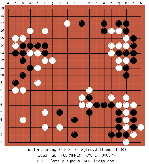 Last move : 0-1 2018 September 22 15:3:58 [Event "FICGS__GO__TOURNAMENT_KYU_I__000077"] [Site "FICGS"] [Date "2018.04.27"] [Round "1"] [Black "Jaslier,Jeremy"] [White "Taylor,William"] [Result "0-1"] [Rating 1 "1100"] [Rating 2 "1430"] 1.r16 c4 2.q4 d16 3.o17 r3 4.q3 r4 5.r6 r5 6.q5 s6 7.r2 s2 8.s3 r7 9.s5 q6 10.s4 r6 11.p2 r1 12.q2 t3 13.k4 f3 14.c14 c15 15.d14 f16 16.c10 j17 17.r11 c8 18.b9 h3 19.k2 b8 20.l17 p16 21.o16 p14 22.q17 r15 23.s15 r14 24.s14 q16 25.r17 r12 26.s12 q11 27.r13 q12 28.q13 p13 29.r10 q14 30.s13 b14 31.b13 b15 32.c12 e9 33.h5 f5 34.p6 p7 35.o6 e11 36.f14 e13 37.e14 d13 38.c13 g12 39.f13 f12 40.d11 l6 41.m7 l7 42.m5 m6 43.n6 m8 0-1 This go game has been lost on time (started : 2018.04.27 11:52:37) Here are the names of the openings (joseki) played in the four corners : Corner q4 : q4 r3 Hoshi (Hwajeom, Seongjeom, Xingwei`) 4-4 Point. The star or hoshi (4-4) point, emphasizing influence at the potential expense of territory. Corner d16 : d16 c14 Hoshi (Hwajeom, Seongjeom, Xingwei`) 4-4 Point. The star or hoshi (4-4) point, emphasizing influence at the potential expense of territory. Ikken Kakari (Hankan Keolch'im, Yi Gua`jiao~, 1-Space Low Approach). Black 2 is the standard approach move to the 4-4. Player White won this Go (weiqi, baduk) game. Follow this game move after move (download)Beginner's games are surprising, often incoherent and incomprehensible. When you improve, your game gains in consistency but flirts with stupidity: you become satisfied with truisms and mechanical movements, you try to obtain a feeling for clearness and style the easy way. (Pierre Audouard) It's unlucky to be superstitious. (Dave Enteles)
