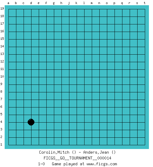 Last move : 1-0 2018 May 30 0:32:56 [Event "FICGS__GO__TOURNAMENT__000014"] [Site "FICGS"] [Date "2018.04.28"] [Round "1"] [Black "Corolin,Mitch"] [White "Anders,Jean"] [Result "1-0"] 1.d4 1-0 This go game has been lost on time (started : 2018.04.28 7:32:8) Here are the names of the openings (joseki) played in the four corners : Corner d4 : d4 1-0 Hoshi (Hwajeom, Seongjeom, Xingwei`) 4-4 Point. The star or hoshi (4-4) point, emphasizing influence at the potential expense of territory. Player Black won this Go (weiqi, baduk) game. Follow this game move after move (download)The possibility or impossibility of an event results logically from the rules. (Pierre Audouard) The quality of decision is like the well-timed swoop of a falcon which enables it to strike and destroy its victim. (Sun Tzu)