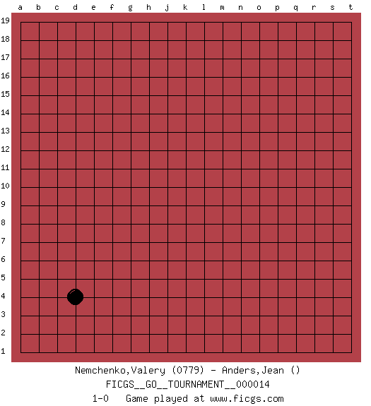 Last move : 1-0 2018 May 28 12:20:36 [Event "FICGS__GO__TOURNAMENT__000014"] [Site "FICGS"] [Date "2018.04.28"] [Round "1"] [Black "Nemchenko,Valery"] [White "Anders,Jean"] [Result "1-0"] [Rating 1 "0779"] 1.d4 1-0 This go game has been lost on time (started : 2018.04.28 7:32:8) Here are the names of the openings (joseki) played in the four corners : Corner d4 : d4 1-0 Hoshi (Hwajeom, Seongjeom, Xingwei`) 4-4 Point. The star or hoshi (4-4) point, emphasizing influence at the potential expense of territory. Player Black won this Go (weiqi, baduk) game. Follow this game move after move (download)A basic: Don't push too hard. (Jansteen) Be who you are, and say what you feel because those who mind don't matter, and those who matter don't mind. (Dr Seuss)