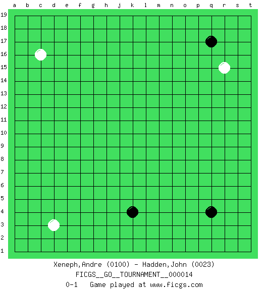 Last move : 0-1 2018 June 5 19:34:38 [Event "FICGS__GO__TOURNAMENT__000014"] [Site "FICGS"] [Date "2018.04.28"] [Round "1"] [Black "Xeneph,Andre"] [White "Hadden,John"] [Result "0-1"] [Rating 1 "0100"] [Rating 2 "0023"] 1.q17 c16 2.q4 d3 3.k4 r15 0-1 Here are the names of the openings (joseki) played in the four corners : Corner q16 : q17 r15 Komoku (Somok, Xiao~mu`) 3-4 Point. The komoku (3-4) point is the traditional corner enclosure move.. Ikken Kakari (Hankan Keolch'im, Yi Gua`jiao~, 1-Space Low Pincer). The small knight move is the basic approach move to the 3-4 point stone. It has been continually used for over four centuries. There are limitless variations, with new moves constantly being discovered. White 2 opens the door to a treaure store of joseki. Player White won this Go (weiqi, baduk) game. Follow this game move after move (download)Learn the eye-stealing tesuji. (Anonymous) If only people were all showed a certain minimum level of niceness; if only people didn't retract verbal draw offers (without draw box ticked) on ficgs; if only people didn't kill; if only people didn't run concentration / extermination camps, if only people didn't drop nuclear bombs on Hiroshima and Nagasaki, and so on - it would be a much more beautiful world. But sadly, things are not so... (Normajean Yates)