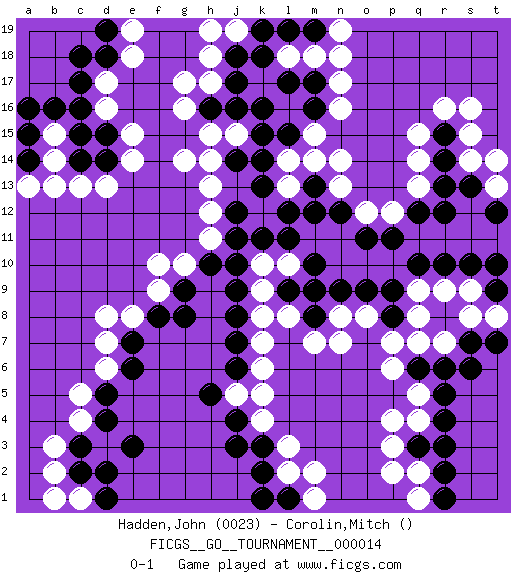 Last move : 0-1 2018 August 30 8:53:50 [Event "FICGS__GO__TOURNAMENT__000014"] [Site "FICGS"] [Date "2018.04.28"] [Round "1"] [Black "Hadden,John"] [White "Corolin,Mitch"] [Result "0-1"] [Rating 1 "0023"] 1.r4 c4 2.c16 r16 3.e3 d7 4.c3 c13 5.c14 d13 6.k16 n16 7.r13 g16 8.h16 g17 9.j14 d17 10.c17 d16 11.d14 h17 12.j17 h15 13.j16 g14 14.j10 g10 15.g8 p4 16.q3 p3 17.q10 l3 18.j3 k4 19.j4 k6 20.j6 p6 21.q6 p7 22.m8 m7 23.p8 o8 24.o9 n8 25.n9 l8 26.m9 q8 27.p9 q7 28.r6 n14 29.n12 f9 30.e7 d8 31.d4 c5 32.d5 b3 33.c2 b2 34.f8 e8 35.e6 d6 36.h10 h11 37.j11 h12 38.j12 q14 39.r14 q15 40.r15 s16 41.m16 n17 42.m17 e14 43.d15 e15 44.d18 e18 45.c18 b14 46.c15 b15 47.b16 c1 48.d1 b1 49.d2 m15 50.l15 l14 51.k14 l13 52.l12 r9 53.r10 s9 54.s10 q13 55.q12 n13 56.m13 j5 57.h5 k5 58.j7 k7 59.l9 k9 60.j9 k10 61.k11 l10 62.m10 o12 63.l11 k8 64.o11 p12 65.p11 q2 66.r2 q4 67.r3 q1 68.r1 p2 69.k3 l2 70.k2 m18 71.l17 l18 72.k18 r7 73.s7 s8 74.s6 s15 75.r12 s14 76.s13 j15 77.k15 h14 78.k13 m14 79.m12 h18 80.j18 e19 81.d19 q5 82.r5 q9 83.g9 f10 84.l1 m1 85.k1 m2 86.j8 j19 87.k19 h19 88.a15 b13 89.a14 a13 90.a16 t13 91.t12 t14 92.l19 n18 93.t9 t8 94.t10 n7 95.t7 h13 96.m19 n19 97.pass pass 0-1 Here are the names of the openings (joseki) played in the four corners : Corner d4 : c4 e3 Komoku (Somok, Xiao~mu`) 3-4 Point. The komoku (3-4) point is the traditional corner enclosure move.. Ikken Kakari (Hankan Keolch'im, Yi Gua`jiao~, 1-Space Low Pincer). The small knight move is the basic approach move to the 3-4 point stone. It has been continually used for over four centuries. There are limitless variations, with new moves constantly being discovered. Black 2 opens the door to a treaure store of joseki. Corner d16 : c16 c13 Komoku (Somok, Xiao~mu`) 3-4 Point. The komoku (3-4) point is the traditional corner enclosure move.. Corner q4 : r4 p4 Komoku (Somok, Xiao~mu`) 3-4 Point. The komoku (3-4) point is the traditional corner enclosure move.. Ikken Takagakari (Hankan Nop'dakeolch'im, Yi Gaogua`jiao~, 1-Space High Approach). The 5-4 approach move has become more popular in modern times, as modern Go emphasizes speed and influence. Player White won this Go (weiqi, baduk) game. Follow this game move after move (download)Don't get surrounded ! Ever ! (Anonymous) Games, world of games... There's always an opponent, and there's always a victim. (Revolver, movie)