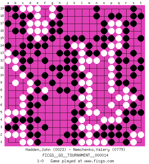 Last move : 1-0 2018 September 8 19:21:25 [Event "FICGS__GO__TOURNAMENT__000014"] [Site "FICGS"] [Date "2018.04.28"] [Round "1"] [Black "Hadden,John"] [White "Nemchenko,Valery"] [Result "1-0"] [Rating 1 "0023"] [Rating 2 "0779"] 1.c4 q16 2.r4 d16 3.f3 p4 4.p3 o4 5.c16 c15 6.c17 d17 7.o3 n3 8.n2 m3 9.q10 p9 10.q9 p10 11.q13 p11 12.q11 p12 13.r16 q15 14.r15 q14 15.n13 p13 16.q12 p8 17.k3 l3 18.k5 l4 19.l5 m5 20.q6 p6 21.n15 p16 22.o16 o15 23.o17 p17 24.r17 q17 25.o14 o13 26.p15 p14 27.o15 n12 28.m13 m12 29.k12 l12 30.k15 l13 31.l8 m6 32.l6 m7 33.l10 m10 34.k13 l14 35.l15 k14 36.m14 l11 37.k11 k10 38.d18 e17 39.c13 b15 40.b16 a15 41.b18 e18 42.g16 l9 43.j14 j13 44.j11 h14 45.j15 g13 46.f14 f13 47.g11 h12 48.h11 g12 49.e14 g14 50.e13 e12 51.d12 e11 52.j12 f11 53.h13 q5 54.j13 j10 55.h10 h9 56.g9 g10 57.f10 e10 58.e9 d9 59.d15 e15 60.d14 d11 61.f15 e16 62.c11 c10 63.g17 d19 64.c18 c19 65.b19 e19 66.a17 a16 67.h8 j9 68.e8 d8 69.d7 c7 70.d6 c6 71.j8 k8 72.k7 l7 73.k9 m8 74.l10 m9 75.k10 q7 76.r14 r18 77.s18 q19 78.p18 o18 79.n18 o19 80.n19 p19 81.s19 r19 82.q18 r6 83.r5 q4 84.q3 n5 85.k4 k2 86.j2 j1 87.l2 m2 88.k1 n1 89.o2 o1 90.p1 m1 91.h1 l1 92.k2 g18 93.h18 g19 94.h19 f17 95.h17 f16 96.g15 h15 97.h16 b11 98.c12 b12 99.b13 a13 100.a14 b14 101.c14 c5 102.d5 b5 103.b4 a4 104.a3 a5 105.b3 r8 106.r9 s9 107.s10 t8 108.s6 s7 109.s5 t6 110.t5 t10 111.s11 t11 112.t12 q1 113.r2 p2 114.q2 s12 115.t9 t10 116.s13 s1 117.s3 t2 118.p1 d4 119.p2 s2 120.r1 a18 121.a19 a2 122.d3 b2 123.e4 c2 124.d2 d1 125.e1 c1 126.e2 c3 127.d4 t14 128.t11 e7 129.f7 s14 130.a14 a12 131.t7 t13 132.r12 t9 133.s8 r7 134.f12 f8 135.d10 b9 136.e6 s15 137.pass s16 138.s17 t17 139.t18 t16 140.t15 1-0 Here are the names of the openings (joseki) played in the four corners : Corner q4 : r4 p4 Komoku (Somok, Xiao~mu`) 3-4 Point. The komoku (3-4) point is the traditional corner enclosure move.. Ikken Takagakari (Hankan Nop'dakeolch'im, Yi Gaogua`jiao~, 1-Space High Approach). The 5-4 approach move has become more popular in modern times, as modern Go emphasizes speed and influence. Corner d16 : d16 c16 Hoshi (Hwajeom, Seongjeom, Xingwei`) 4-4 Point. The star or hoshi (4-4) point, emphasizing influence at the potential expense of territory. Corner q16 : q16 q13 Hoshi (Hwajeom, Seongjeom, Xingwei`) 4-4 Point. The star or hoshi (4-4) point, emphasizing influence at the potential expense of territory. Niken Takagakari (Dukan Nop'dakeolch'im, E`r Gaojia, 2-Space High Approach). Black 2 is a light approach move. Rarely played in even games, Black 2 is typically employed in handicap games. White continues with 6-4 or 3-10. In Korean Sunjang Baduk White has a stone on 8-4. Player Black won this Go (weiqi, baduk) game. Follow this game move after move (download)The poor player plays the opponent's game for him. (Anonymous) Gambling is the son of avarice and the father of despair. (French proverb)