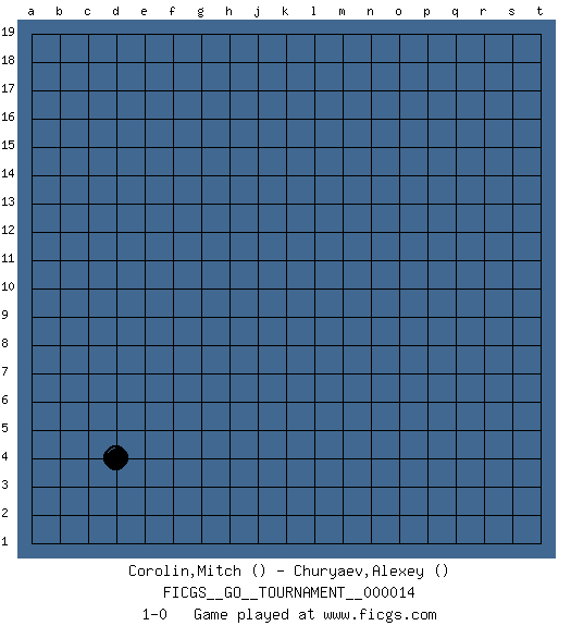 Last move : 1-0 2018 May 30 0:32:56 [Event "FICGS__GO__TOURNAMENT__000014"] [Site "FICGS"] [Date "2018.04.28"] [Round "1"] [Black "Corolin,Mitch"] [White "Churyaev,Alexey"] [Result "1-0"] 1.d4 1-0 This go game has been lost on time (started : 2018.04.28 7:32:8) Here are the names of the openings (joseki) played in the four corners : Corner d4 : d4 1-0 Hoshi (Hwajeom, Seongjeom, Xingwei`) 4-4 Point. The star or hoshi (4-4) point, emphasizing influence at the potential expense of territory. Player Black won this Go (weiqi, baduk) game. Follow this game move after move (download)In the opening, when you don't know what to play, make a shimari. (Jansteen) All battles are fought by scared men who'd rather be someplace else. (John Wayne in the movie In harm's way)