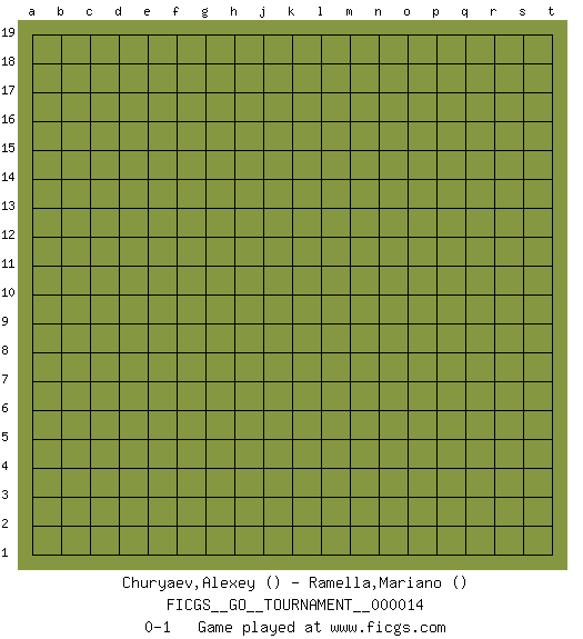Last move : 0-1 2018 May 28 12:20:36 [Event "FICGS__GO__TOURNAMENT__000014"] [Site "FICGS"] [Date "2018.04.28"] [Round "1"] [Black "Churyaev,Alexey"] [White "Ramella,Mariano"] [Result "0-1"] 0-1 This go game has been lost on time (started : 2018.04.28 7:32:8) Here are the names of the openings (joseki) played in the four corners : Player White won this Go (weiqi, baduk) game. Follow this game move after move (download)Josekis are not fixed, definitive things. They indicate the moments when everything can change. (Pierre Audouard) Somewhere in the world there is an epigram for every dilemma. (Hendrik Willem van Loon)