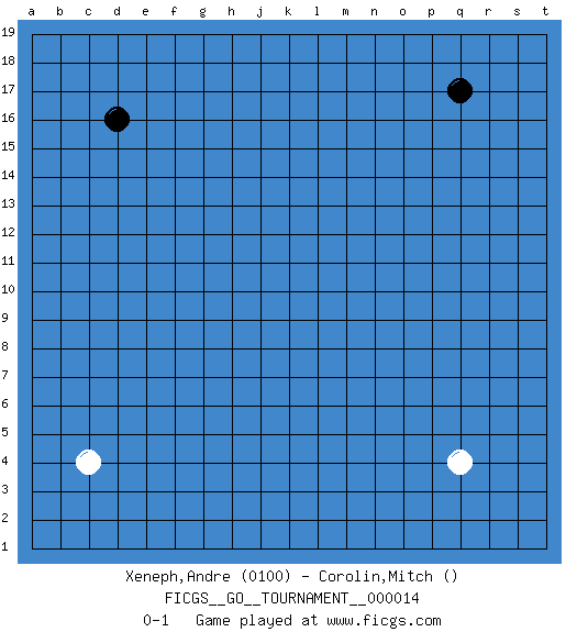 Last move : 0-1 2018 June 3 12:52:57 [Event "FICGS__GO__TOURNAMENT__000014"] [Site "FICGS"] [Date "2018.04.28"] [Round "1"] [Black "Xeneph,Andre"] [White "Corolin,Mitch"] [Result "0-1"] [Rating 1 "0100"] 1.q17 q4 2.d16 c4 0-1 This go game has been lost on time (started : 2018.04.28 7:32:8) Here are the names of the openings (joseki) played in the four corners : Corner d4 : c4 0-1 Komoku (Somok, Xiao~mu`) 3-4 Point. The komoku (3-4) point is the traditional corner enclosure move.. Player White won this Go (weiqi, baduk) game. Follow this game move after move (download)Don't get surrounded ! Ever ! (Anonymous) I know the human being and fish can coexist peacefully. (George W. Bush, Saginaw sept. 29, 2000)
