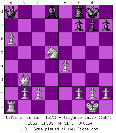 Last move : 1-0 2018 May 31 12:1:28 [Event "FICGS__CHESS__RAPID_C__000164"] [Site "FICGS"] [Date "2018.04.28"] [Round "1"] [White "Cafiero,Florian"] [Black "Trigance,Emile"] [Result "1-0"] [WhiteElo "1519"] [BlackElo "1584"] 1.e4 c5 2.Nc3 Nc6 3.Bb5 Nd4 4.Nf3 Nxb5 5.Nxb5 a6 6.Nc3 e6 7.d4 cxd4 8.Qxd4 d6 9.O-O e5 10.Qb4 Nf6 11.Bg5 Be7 12.Bxf6 Bxf6 13.Rfd1 Be7 14.Nxe5 O-O 15.Nc4 d5 16.Qb6 Bg4 17.Rxd5 Qc8 18.Qb3 Be6 19.Nb6 Qc6 20.Nxa8 b5 21.a4 Bxd5 22.Nxd5 Bd8 23.axb5 Qxa8 24.bxa6 1-0 Sicilian : Closed, 2...Nc6 Kingside Castling by player White (move 9) Kingside Castling by player Black (move 14) Player White won this chess game. Follow this game move after move (download)Could we look into the head of a Chess player, we should see there a whole world of feelings, images, ideas, emotion and passion. (Alfred Binet) Schach ist die gewalttätigste aller Sportarten. (Garry Kasparov) Si el Ajedrez es una ciencia, es la mas inexacta. Si el Ajedrez es un arte, es demasiado inexacto para ser visto como tal. Si el Ajedrez es un deporte, es demasiado esotérico. Si el Ajedrez es un juego, es demasiado exigente para ser solo un juego. Si el Ajedrez es una aventura, es una muy demandante. Si el Ajedrez es una pasión, es una muy gratificante. Si el Ajedrez es la vida, es una muy triste. (Anónimo) La victoire dans une partie d'Echecs appartient la plupart du temps à celui qui voit un peu plus loin que l'adversaire. (Lasker) I find television to be very educating. Every time somebody turns on the set, I go in the other room and read a book. (Groucho Marx)