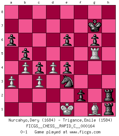 Last move : 0-1 2018 July 27 15:48:46 [Event "FICGS__CHESS__RAPID_C__000164"] [Site "FICGS"] [Date "2018.04.28"] [Round "1"] [White "Nurcahyo,Dery"] [Black "Trigance,Emile"] [Result "0-1"] [WhiteElo "1684"] [BlackElo "1584"] 1.f3 d5 2.d4 c5 3.e3 e6 4.Bb5+ Bd7 5.Bxd7+ Nxd7 6.Ne2 c4 7.Nbc3 Ngf6 8.a3 a6 9.Bd2 Bd6 10.O-O Qc7 11.b4 Bxh2+ 12.Kh1 Bd6 13.Qe1 O-O 14.g4 b5 15.Kg2 g6 16.Rh1 Kg7 17.Qh4 h5 18.Rag1 Rh8 19.Qg5 Nh7 20.Qh4 Nhf6 21.Rh3 hxg4 22.Qe1 Rxh3 23.Nf4 Bxf4 24.exf4 Rah8 25.Be3 gxf3+ 26.Kf1 Rh2 27.Qg3 Ne4 28.Nxe4 dxe4 29.c3 Nf6 30.Bf2 Nd5 31.f5 Qxg3 32.Rxg3 Rh1+ 33.Bg1 R8h2 34.fxg6 fxg6 35.Rg5 Ne3+ 36.Ke1 f2+ 0-1 Gedult's Opening Kingside Castling by player White (move 10) Kingside Castling by player Black (move 13) Player Black won this chess game. Follow this game move after move (download)Don't even mention losing to me. I can't stand to think of it. (Bobby Fischer) Smyslow ist ein Beweis dafür, dass ich noch zehn Jahre spielen kann! [der 75 jährige über den 85 jährigen] (Viktor Kortschnoi) El juego de Fischer siempre fue nítido, racional y brillante. Uno de los mejores por siempre. (Dave Regis) Les Echecs représentent une sphère d'idées créatrices basée sur la volonté des deux protagonistes. (Smyslov) It is not true that people stop pursuing dreams because they grow old, they grow old because they stop pursuing dreams. (Gabriel Garcia Marquez)