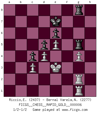 Last move : 1/2-1/2 2018 September 15 1:34:29 [Event "FICGS__CHESS__RAPID_GOLD__000006"] [Site "FICGS"] [Date "2018.04.29"] [Round "1"] [White "Riccio,Eros"] [Black "Bernal Varela,Nelson"] [Result "1/2-1/2"] [WhiteElo "2437"] [BlackElo "2277"] 1.e4 e6 2.d4 d5 3.e5 c5 4.c3 Nc6 5.Nf3 Qb6 6.a3 c4 7.Nbd2 Na5 8.Be2 Bd7 9.O-O Ne7 10.Rb1 Qc7 11.Re1 Nc8 12.Nf1 Nb6 13.Bf4 h6 14.Qd2 Ba4 15.h4 O-O-O 16.Bg3 Kb8 17.h5 Be7 18.N3h2 Rdf8 19.Bg4 Rhg8 20.f4 Bd7 21.Qf2 g6 22.Ne3 Ka8 23.Re2 Nc6 24.Rf1 Qd8 25.Qe1 Bc8 26.Nf3 Rh8 27.Bh3 Qe8 28.Ng4 Nd7 29.Bh4 Bxh4 30.Qxh4 Ne7 31.Nf6 Qd8 32.g3 Kb8 33.Kf2 a6 34.Ke1 Ka7 35.Rh1 Nb6 36.Bg4 Na4 37.Qh3 Qa5 38.Kf2 Qb6 39.Kg2 Qc6 40.Nh2 Nb6 41.Bf3 Qc7 42.Nhg4 Nd7 43.Kf1 Nxf6 44.Nxf6 Ng8 45.Qh4 Bd7 46.Rf2 Qc8 47.Ke1 Nxf6 48.Qxf6 Qe8 49.Kd1 Rfg8 50.Kc1 Qf8 51.Bd1 a5 52.Kd2 Rg7 53.Rg2 Kb8 54.Bc2 gxh5 55.Rxh5 b5 56.g4 Kb7 57.Rh1 Rhg8 58.Qh4 b4 59.axb4 axb4 60.R2g1 Rh8 61.Ke3 Rhg8 62.Rg2 Bc6 63.Rf1 Kc7 64.f5 bxc3 65.bxc3 Qa3 66.Kd2 Rg5 67.fxe6 fxe6 68.Qxh6 Bd7 69.Rfg1 Qb2 70.Qf6 Qa3 71.Qf4 Qa2 72.Qf1 Ba4 73.Qb1 Qxc2+ 74.Qxc2 Bxc2 75.Kxc2 Kd7 76.Kd2 Ke7 77.Ke3 1/2-1/2 French : Advance, Paulsen attack Kingside Castling by player White (move 9) Queenside Castling by player Black (move 15) This chess game ended in a draw. Follow this game move after move (download)The tactician knows what to do when there is something to do; whereas the strategian knows what to do when there is nothing to do. (Gerald Abrahams) Mit sehr nachdenklichem Gesicht schreitet Bobby durch den Turniersaal. Was ist passiert?, fragt Lombardy. Ich stehe schlecht, antwortet Fischer. Lombardy: Dann biete doch einfach Remis an. Fischer: So schlecht stehe ich nun auch wieder nicht! (Robert James Fischer) El juego de Damas es para vagabundos. (Paul Morphy) Les Cavaliers se révèlent fort utiles dans les positions fermées. D'habitude, les Fous sont un peu plus forts que les Cavaliers dans les positions ouvertes. Qu'on le veuille ou non, il restera toujours des exceptions ! Fear is the path to the dark side. Fear leads to anger; anger leads to hate; hate leads to suffering. I sense much fear in you. (Master Yoda in Star Wars ep.1)