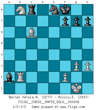 Last move : 1/2-1/2 2018 May 15 8:1:19 [Event "FICGS__CHESS__RAPID_GOLD__000006"] [Site "FICGS"] [Date "2018.04.29"] [Round "2"] [White "Bernal Varela,Nelson"] [Black "Riccio,Eros"] [Result "1/2-1/2"] [WhiteElo "2277"] [BlackElo "2437"] 1.Nf3 Nf6 2.g3 d5 3.Bg2 c5 4.O-O e6 5.d4 cxd4 6.Nxd4 e5 7.Nf3 Nc6 8.c4 d4 9.e3 Be7 10.exd4 exd4 11.Bf4 O-O 12.Ne5 Qb6 13.Re1 Nxe5 14.Bxe5 Rd8 15.Nd2 Bg4 16.Qb3 Bb4 17.Bc7 Qxc7 18.Qxb4 a5 19.Qe7 Rd7 20.Qe5 Qb6 21.c5 Qc7 22.Nb3 a4 23.c6 bxc6 24.Qxc7 Rxc7 25.Nxd4 Rb8 26.b3 c5 27.Rec1 Ne8 28.Nc6 axb3 29.Nxb8 b2 30.Rab1 bxc1R+ 31.Rxc1 c4 32.h3 Bc8 33.Bc6 Kf8 34.Rxc4 Be6 35.Rc2 Rc8 36.Rb2 Bxa2 1/2-1/2 Reti Opening Kingside Castling by player White (move 4) Kingside Castling by player Black (move 11) Promotion Rook by player Black (move 30) This chess game ended in a draw. Follow this game move after move (download)Chess is really ninety nine percent calculation. (Soltis) Dass jemand wie Surab Asmaiparaschwili, der selbst Elopunkte gekauft hat , Vize-Präsident der Fide werden konnte, sagt schon einges über den Zustand dieser Organisation aus. (Joel Lautier) Uno no tiene que jugar muy bien, es suficiente jugar mejor que el oponente. (Siegbert Tarrasch) Un footballeur joue avec ses pieds, parfois avec sa tête. Un joueur d'échecs ne joue qu'avec sa tête. Et quand il ne joue plus, il meurt. (Jacob Murray) Do you know these so called Volunteers don't even get paid! (Simpsons)