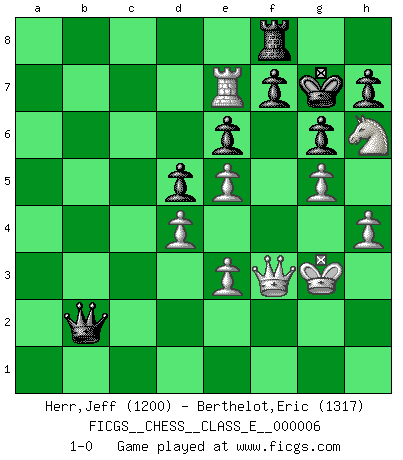 Last move : 1-0 2006 December 3 16:53:49 [Event "FICGS__CHESS__CLASS_E__000006"] [Site "FICGS"] [Date "2006.06.07"] [Round "1"] [White "Herr,Jeff"] [Black "Berthelot,Eric"] [Result "1-0"] [WhiteElo "1200"] [BlackElo "1317"] 1.d4 d5 2.c4 e6 3.a3 Nf6 4.e3 Be7 5.Nc3 Nbd7 6.Nf3 c6 7.Bd3 O-O 8.O-O b6 9.cxd5 cxd5 10.e4 Bb7 11.e5 Ne8 12.Qc2 g6 13.Bh6 Ng7 14.Ne2 Rc8 15.Qa4 a5 16.Bb5 Nb8 17.Rac1 Rxc1 18.Rxc1 Ba6 19.Bxa6 Nxa6 20.Qb5 Nb8 21.Nc3 Re8 22.Na4 Nf5 23.Be3 Nxe3 24.fxe3 Nd7 25.Rc6 Bf8 26.Nxb6 Nxb6 27.Rxb6 Bh6 28.Kf2 Qc8 29.Rc6 Qd8 30.b4 axb4 31.axb4 Qa8 32.Ra6 Qc8 33.Qe2 Qb8 34.b5 Rc8 35.Rc6 Rd8 36.h3 Re8 37.g4 Qa8 38.g5 Bf8 39.h4 Rb8 40.Nh2 Qa5 41.Ra6 Qc7 42.Ng4 Kg7 43.Ra2 Be7 44.Nh6 Qd7 45.Qf3 Rf8 46.b6 Qb7 47.Ra7 Qxb6 48.Rxe7 Qb2+ 49.Kg3 1-0 Queen's gambit declined Kingside Castling by player Black (move 7) Kingside Castling by player White (move 8) Player White won this chess game. Follow this game move after move (download)Chess is war over the board. The object is to crush the opponents mind. (Bobby Fischer) Ohne Leiden bildet sich kein Charakter. (Ernst Freiherr von Feuchtersleben) La batalla por la última verdad nunca sera ganada. Y es por eso que el Ajedrez es tan fascinante. (Hans Kmoch) En blitz, le Cavalier l'emporte sur le Fou. (Vlastimil Hort) My poor ole parrot... Is not in the circulation of displays ....poo hoo hoo :) (Wayne Lowrance's enigma)