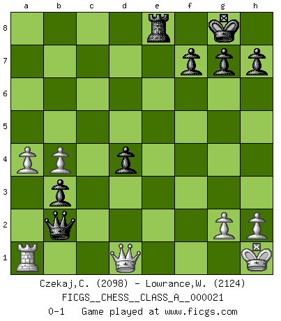 Last move : 0-1 2007 November 18 23:21:27 [Event "FICGS__CHESS__CLASS_A__000021"] [Site "FICGS"] [Date "2007.05.02"] [Round "1"] [White "Czekaj,Christophe"] [Black "Lowrance,Wayne"] [Result "0-1"] [WhiteElo "2098"] [BlackElo "2124"] 1.d4 Nf6 2.Nf3 d5 3.e3 e6 4.Bd3 c5 5.b3 Nc6 6.O-O Be7 7.Bb2 O-O 8.Nbd2 cxd4 9.exd4 Nb4 10.Be2 Nc6 11.Ne5 Qb6 12.Ndf3 Ne4 13.c4 a5 14.Rc1 a4 15.cxd5 exd5 16.Nxc6 bxc6 17.Ne5 c5 18.dxc5 Bxc5 19.Nd3 Bd6 20.b4 Re8 21.a3 Ba6 22.Rc2 Bc4 23.Nc1 Bb3 24.Nxb3 axb3 25.Rc1 Bf4 26.Ra1 Be3 27.fxe3 Qxe3+ 28.Kh1 Nf2+ 29.Rxf2 Qxf2 30.Bb5 Qxb2 31.Bxe8 Rxe8 32.a4 d4 0-1 Queen's pawn game Kingside Castling by player White (move 6) Kingside Castling by player Black (move 7) Player Black won this chess game. Follow this game move after move (download)You cannot play at Chess if you are kind-hearted. (French Proverb) Die Leute spielen gegen mich seit 15 Jahren unter Ihren Möglichkeiten. (Robert James Fischer) Si no le temes a Spassky, entonces elimino el elemento del dinero. (Jim Slater) Echiquier : carré parfait, comme la Jérusalem nouvelle décrite par l'auteur de l'Apocalypse, huit cases sur huit, exaltation du chiffre 4, symbole du cosmos aux quatre horizons... où le noir et le blanc, l'ombre et la lumière, le mal et le bien s'entremêlent et se conjuguent. (Robert Couffignal, Le Gambit du poète) History is the quarrels of popes and kings, with wars or pestilences in every page; the men all so good for nothing, and hardly any women at all. (Jane Austen)