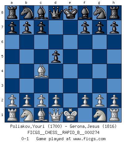 Last move : 0-1 2018 June 15 2:50:44 [Event "FICGS__CHESS__RAPID_B__000274"] [Site "FICGS"] [Date "2018.04.29"] [Round "1"] [White "Poliakov,Youri"] [Black "Gerona,Jesus"] [Result "0-1"] [WhiteElo "1700"] [BlackElo "1816"] 1.e4 e6 2.Bc4 d5 3.exd5 exd5 0-1 This chess game has been lost on time (started : 2018.04.29 20:26:23) French defense Player Black won this chess game. Follow this game move after move (download)Chess is played with the mind and not with the hands ! (Renaud and Kahn) Stelle das Brett so, daß die Sonne in die Augen deines Gegners scheint. (Ruy López) Aquel que toma al Peón de Caballo de la Reina, se pasará la noche a dormir en la calle. (Anónimo) Aux échecs, les retours au sommet sont rares : les dommages psychologiques consécutifs à une défaite sont trop sévères. (Daily Telegraph) Memory is a complicated thing, a relative to truth, but not its twin. (Barbara Kingsolver, Animal Dreams)