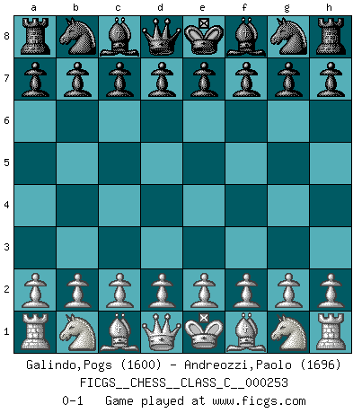 Last move : 0-1 2018 June 10 2:5:43 [Event "FICGS__CHESS__CLASS_C__000253"] [Site "FICGS"] [Date "2018.04.30"] [Round "1"] [White "Galindo,Pogs"] [Black "Andreozzi,Paolo"] [Result "0-1"] [WhiteElo "1600"] [BlackElo "1696"] 0-1 This chess game has been lost on time (started : 2018.04.30 22:36:4) Player Black won this chess game. Follow this game move after move (download)Even the laziest King flees wildly in the face of a double check ! (Aaron Nimzowitsch) Du musst nicht gut spielen, es reicht, wenn du besser spielst als dein Gegner. (Anonymous) Dios mío, Bobby Fischer juega tan simple. (Alexei Suetin) Soyez une menace à chaque fois que vous vous asseyez pour jouer. (Ken Smith) Memory is a way of holding onto the things you love, the things you are, the things you never want to lose. (from the television show: The Wonder Years)
