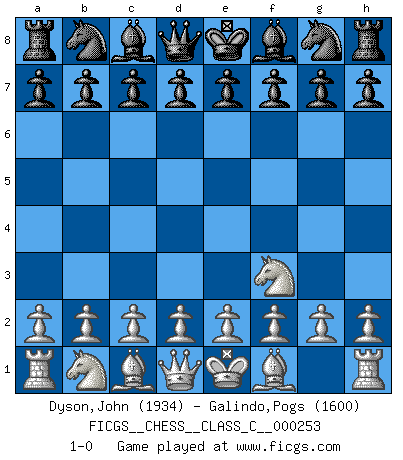 Last move : 1-0 2018 June 10 2:5:43 [Event "FICGS__CHESS__CLASS_C__000253"] [Site "FICGS"] [Date "2018.04.30"] [Round "1"] [White "Dyson,John"] [Black "Galindo,Pogs"] [Result "1-0"] [WhiteElo "1934"] [BlackElo "1600"] 1.Nf3 1-0 This chess game has been lost on time (started : 2018.04.30 22:36:4) Reti Opening Player White won this chess game. Follow this game move after move (download)Fischer was a master of clarity and a king of artful positioning. His opponents would see where he was going but were powerless to stop him. (Bruce Pandolfini) Nicht daß Diemer aus Opportunismus Mitglied der NSDAP geworden wäre. Er war ein Fanatiker, in allem, was er tat. (Hans Ree) El Ajedrez es en su esencia, un juego. En su forma, un arte. Y en su ejecución, una ciencia. (Baron Tassilo) Aux échecs, l'amour-propre est satisfait quand on remporte la victoire, mais il n'y a pas de honte à être battu. (Benjamin Franklin) There is far too much law for those who can afford it and far too little for those who cannot. (Derek Bok)