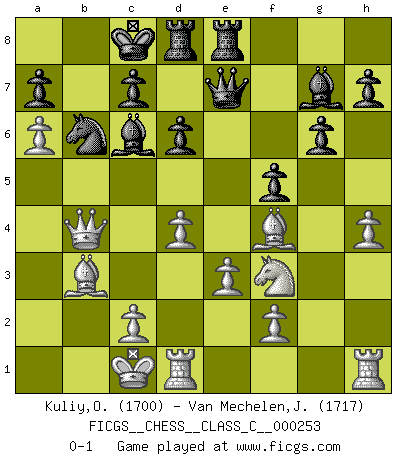 Last move : 0-1 2018 August 9 21:57:8 [Event "FICGS__CHESS__CLASS_C__000253"] [Site "FICGS"] [Date "2018.04.30"] [Round "1"] [White "Kuliy,Oleksandr"] [Black "Van Mechelen,Jan"] [Result "0-1"] [WhiteElo "1700"] [BlackElo "1717"] 1.d4 f5 2.Bf4 Nf6 3.e3 g6 4.Nf3 Bg7 5.h3 d6 6.Bc4 e6 7.g4 Qe7 8.Nc3 Nbd7 9.Qe2 Nb6 10.Bb3 Bd7 11.O-O-O O-O-O 12.gxf5 exf5 13.a4 Ne4 14.a5 Nxc3 15.bxc3 Na8 16.a6 b5 17.c4 bxc4 18.Qxc4 Nb6 19.Qb4 Rhe8 20.h4 Bc6 0-1 Dutch Queenside Castling by player White (move 11) Queenside Castling by player Black (move 11) Player Black won this chess game. Follow this game move after move (download)The game of chess is the touchstone of the intellect. (Goethe) Die Elozahlen sind sehr schlecht für das Schach. Jetzt ist Schach eine Sportindustrie, die darauf zielt Elopunkte zu machen. (Miguel Najdorf) Bendita sea la memoria de aquel que dio al mundo este juego inmortal. (A. G. Gardiner) J'apprécie les joueurs d'est-indienne, c'est grâce à eux que je nourris ma famille depuis tant d'années. (Petrosian) A generalist learns less and less about more and more until he knows nothing about everything. (Author unknown)