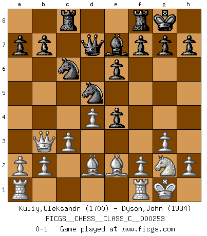Last move : 0-1 2018 August 16 10:30:55 [Event "FICGS__CHESS__CLASS_C__000253"] [Site "FICGS"] [Date "2018.04.30"] [Round "1"] [White "Kuliy,Oleksandr"] [Black "Dyson,John"] [Result "0-1"] [WhiteElo "1700"] [BlackElo "1934"] 1.d4 d5 2.Bf4 Nf6 3.e3 c5 4.c3 Nc6 5.Nd2 cxd4 6.exd4 Bf5 7.Ngf3 e6 8.Qb3 Qc8 9.Nh4 Be4 10.Nxe4 dxe4 11.g3 Be7 12.Ng2 O-O 13.Be2 Nd5 14.Bd2 Qd7 15.O-O Rac8 0-1 This chess game has been lost on time (started : 2018.04.30 22:36:4) Queen's pawn, Mason variation Kingside Castling by player Black (move 12) Kingside Castling by player White (move 15) Player Black won this chess game. Follow this game move after move (download)Before the endgame, the Gods have placed the middle game. (Siegbert Tarrasch) Um dein Spiel zu verbessern musst du zuallererst das Endspiel studieren, denn diese kann unabhängig studiert werden. Die Eröffnung und das Mittelspiel müssen immer in Bezug gesetzt werden zum Endspiel. (José Raúl Capablanca) El Ajedrez, como la música, como el amor, tiene el poder de hacer feliz a la gente. (Siegbert Tarrasch) Les pièces de l'échiquier étaient impitoyables. Elles le retenaient, elles l'absorbaient. Il y avait de l'horreur en cela, mais aussi une harmonie unique. Car, qu'y a-t-il dans le monde, à part les échecs ? (V. Nabokov) Perhaps the current trend of many chess professionals taking up the more lucrative pastime of poker is not a wholly negative one. It may not be too late for humans to relearn how to take risks in order to innovate and thereby maintain the advanced lifestyles we enjoy. And if it takes a poker-playing supercomputer to remind us that we can't enjoy the rewards without taking the risks, so be it. (The Chess Master and the Computer, by Garry Kasparov - 2010)