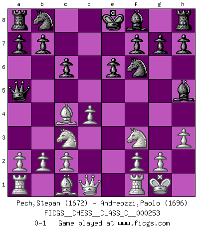 Last move : 0-1 2018 July 31 20:50:8 [Event "FICGS__CHESS__CLASS_C__000253"] [Site "FICGS"] [Date "2018.04.30"] [Round "1"] [White "Pech,Stepan"] [Black "Andreozzi,Paolo"] [Result "0-1"] [WhiteElo "1672"] [BlackElo "1696"] 1.e4 d5 2.exd5 Qxd5 3.Nc3 Qa5 4.d4 Nf6 5.Nf3 c6 6.Bc4 Bg4 7.O-O e6 8.h3 Bh5 0-1 This chess game has been lost on time (started : 2018.04.30 22:36:4) Scandinavian (centre counter) defense Kingside Castling by player White (move 7) Player Black won this chess game. Follow this game move after move (download)You may learn much more from a game you lose than from a game you win. You will have to lose hundreds of games before becoming a good player. (Jose Raul Capablanca) Wenn du gegen Bobby spielst, ist es keine Frage von gewinnen oder verlieren. Es ist eine Frage des Überlebens. (Boris Vassilievich Spassky) Combinaciones deslumbrantes son para la mayoría, mover madera es para los pocos. (Georg Kieninger) On n'a jamais que l'âge auquel on a commence à jouer aux échecs car après on cesse de vieillir. (Capablanca) Beep ! (R2D2 in Star Wars ep.3)