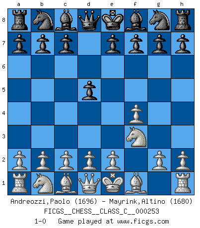 Last move : 1-0 2018 June 14 14:43:18 [Event "FICGS__CHESS__CLASS_C__000253"] [Site "FICGS"] [Date "2018.04.30"] [Round "1"] [White "Andreozzi,Paolo"] [Black "Mayrink,Altino"] [Result "1-0"] [WhiteElo "1696"] [BlackElo "1680"] 1.f4 d5 2.Nf3 1-0 This chess game has been lost on time (started : 2018.04.30 22:36:4) Bird's Opening Player White won this chess game. Follow this game move after move (download)Winning isn't everything... but losing is nothing. (Mednis) Ich habe Kasparov in Rente geschickt. (Veselin Topalov) Dios mío, Bobby Fischer juega tan simple. (Alexei Suetin) Il (Jacob Murray) ne joue pas pour le bon coup, mais pour le meilleur. (Eloi Relange) Being number two sucks. (Andre Agassi)