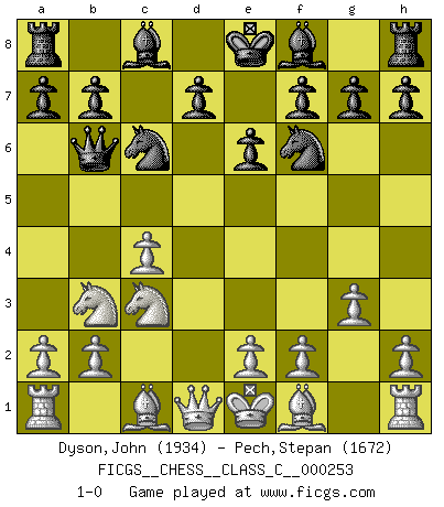 Last move : 1-0 2018 July 18 20:3:43 [Event "FICGS__CHESS__CLASS_C__000253"] [Site "FICGS"] [Date "2018.04.30"] [Round "1"] [White "Dyson,John"] [Black "Pech,Stepan"] [Result "1-0"] [WhiteElo "1934"] [BlackElo "1672"] 1.Nf3 Nf6 2.c4 c5 3.Nc3 Nc6 4.d4 cxd4 5.Nxd4 e6 6.g3 Qb6 7.Nb3 1-0 This chess game has been lost on time (started : 2018.04.30 22:36:4) Reti Opening Player White won this chess game. Follow this game move after move (download)I still hope to kill Fischer. (Boris Spassky) Im Spitzenschach von heute geht es nur um Vorbereitung, um tiefgründige, sorgfältige Eröffnungsvorbereitung. (Nigel Short) El Ajedrez es parte de una cultura y si una cultura esta en decadencia, entonces también el Ajedrez declinará. (Mikhail Botvinnik) Un millionnaire : 'Monsieur Steinitz ! Vous ne participez aux tournois que pour l'argent, alors que moi je n'y viens que pour l'honneur.' Steinitz : 'Chacun joue pour ce qu'il n'a pas'... We cannot be sure of having something to live for unless we are willing to die for it. (Ernesto Che Guevara)