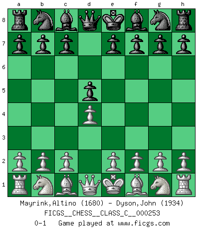 Last move : 0-1 2018 June 10 14:9:44 [Event "FICGS__CHESS__CLASS_C__000253"] [Site "FICGS"] [Date "2018.04.30"] [Round "1"] [White "Mayrink,Altino"] [Black "Dyson,John"] [Result "0-1"] [WhiteElo "1680"] [BlackElo "1934"] 1.d4 d5 0-1 This chess game has been lost on time (started : 2018.04.30 22:36:4) Queen's pawn game Player Black won this chess game. Follow this game move after move (download)In life, as in Chess, one's own Pawns block one's way. A man's very wealth, ease, leisure, children, books, which should help him to win, more often checkmate him. (Charles Buxton) Der Partner hat auch seine Existenzberechtigung. (Savielly Grigorievitsch Tartakower) El Ajedrez es un mar en el cual un mosquito puede beber y un elefante puede bañarse. (Refrán Hindú) On croit qu'il y a plus de mauvais joueurs que de bons joueurs, c'est faux : Il y a autant de joueurs qui gagnent que de joueurs qui perdent. (Philippe Geluck) The general who wins the battle makes many calculations in his temple before the battle is fought. The general who loses makes but few calculations beforehand. (Sun Tzu)