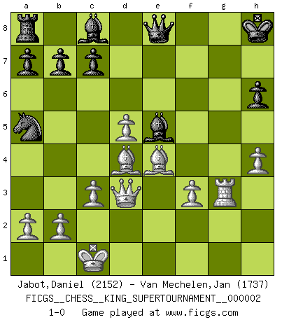 Last move : 1-0 2018 June 11 12:17:52 [Event "FICGS__CHESS__KING_SUPERTOURNAMENT__000002"] [Site "FICGS"] [Date "2018.05.01"] [Round "1"] [White "Jabot,Daniel"] [Black "Van Mechelen,Jan"] [Result "1-0"] [WhiteElo "2152"] [BlackElo "1737"] 1.e4 e5 2.f4 exf4 3.Nf3 g5 4.Nc3 Nc6 5.h4 g4 6.Ng5 h6 7.Nxf7 Kxf7 8.d4 f3 9.gxf3 d5 10.Nxd5 Nf6 11.Bc4 Kg7 12.Be3 Na5 13.Bd3 Nxd5 14.exd5 Qxd5 15.Be4 Qe6 16.d5 Qe8 17.Qd3 Bb4+ 18.c3 Bd6 19.O-O-O g3 20.Bd4+ Be5 21.Rhg1 Rg8 22.Rxg3+ Kh8 23.Rdg1 Rxg3 24.Rxg3 1-0 KGA : Quaade gambit Queenside Castling by player White (move 19) Player White won this chess game. Follow this game move after move (download)The passion for playing Chess is one of the most unaccountable in the world. (H.G. Wells) Bis zum Jahr 1971 verlief in meiner Schachkariere alles glatt. Dieses dramatische Match [Fischer-Taimanov 6:0] machte mein Leben zur Hölle. (Mark Taimanov) Solo los afeminados hacen el Enroque. (Rob Sillars) Celui qui prend des risques peut perdre, celui qui n'en prend pas perd toujours. (Xavier Tartacover) It's not the will to win, but the will to prepare to win that makes the difference. (Bear Bryant)
