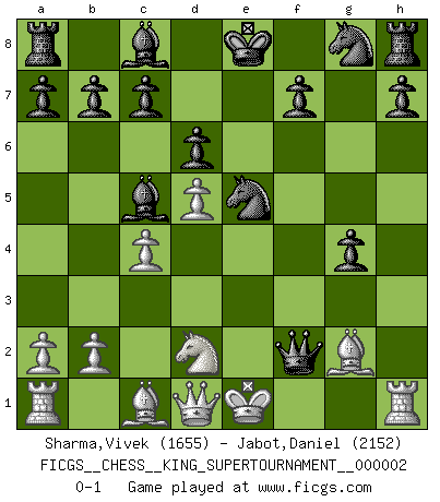 Last move : 0-1 2018 May 17 10:12:49 [Event "FICGS__CHESS__KING_SUPERTOURNAMENT__000002"] [Site "FICGS"] [Date "2018.05.01"] [Round "1"] [White "Sharma,Vivek"] [Black "Jabot,Daniel"] [Result "0-1"] [WhiteElo "1655"] [BlackElo "2152"] 1.e4 e5 2.f4 exf4 3.d4 Qh4+ 4.g3 fxg3 5.Bg2 gxh2 6.Kf1 hxg1Q+ 7.Kxg1 Qd8 8.d5 Bc5+ 9.Kf1 d6 10.c4 Qf6+ 11.Bf3 Nd7 12.Nd2 g5 13.e5 Nxe5 14.Ke1 g4 15.Bg2 Qf2+ 0-1 KGA : Villemson (Steinitz) gambit Promotion Queen by player Black (move 6) Player Black won this chess game. Follow this game move after move (download)The Pin is mightier than the sword. (Fred Reinfeld) Im Blitz ist es einfacher mit einer Figur weniger anzugreifen, als sich mit einer Mehrfigur zu verteidigen. (Mikhail Nekhemyevich Tal) Las Aperturas te enseñan aperturas. ¡Los Finales te enseñan Ajedrez!. (Stephan Gerzadowicz) Les échecs sont un jeu par leur forme, un art par leur essence et une science par sa difficulté d'acquisition. Ils peuvent vous procurer autant de plaisir qu'un bon livre ou une belle musique, mais vous n'aurez une réelle joie que si vous arrivez à bien jouer. (Tigran Petrosian) Wisdom begins at the end. (Daniel Webster)