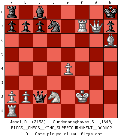 Last move : 1-0 2018 July 2 12:38:19 [Event "FICGS__CHESS__KING_SUPERTOURNAMENT__000002"] [Site "FICGS"] [Date "2018.05.01"] [Round "1"] [White "Jabot,Daniel"] [Black "Sundararaghavan,Shailesh"] [Result "1-0"] [WhiteElo "2152"] [BlackElo "1649"] 1.e4 e5 2.f4 Be7 3.Nf3 exf4 4.Bc4 Bh4+ 5.g3 fxg3 6.O-O gxh2+ 7.Kh1 Bf6 8.Ne5 Nh6 9.d4 d6 10.Bxh6 dxe5 11.Qh5 O-O 12.dxe5 Bxe5 13.Bxf7+ Kh8 14.Qxe5 Rxf7 15.Rxf7 Qd1+ 16.Kxh2 Qe2+ 17.Kg1 Qg4+ 18.Kf1 Qd1+ 19.Kf2 Qxc2+ 20.Nd2 Nd7 21.Qxg7+ 1-0 King's gambit Kingside Castling by player White (move 6) Kingside Castling by player Black (move 11) Player White won this chess game. Follow this game move after move (download)Bobby Fischer is the greatest Chess genius of all time ! (Alexander Kotov) Ich hatte Zahnschmerzen im ersten Spiel. In der zweiten Partie tat mir der Kopf weh. In der dritten war es eine Rheuma-Attacke und während der vierten fühlte ich mich nicht gut. Und in der fünften? Nun, man muss doch nicht jedes Spiel gewinnen, oder? (Savielly Grigorievitsch Tartakower) El hombre es un frívolo, una creatura engañosa y como un jugador de Ajedrez, se preocupa mas por el proceso de obtener su meta que de la meta por sí misma. (Dostoyevsky) Les sacrifices démontrent seulement que quelqu'un a gaffé. (Savielly Tartacover) It's unlucky to be superstitious. (Dave Enteles)