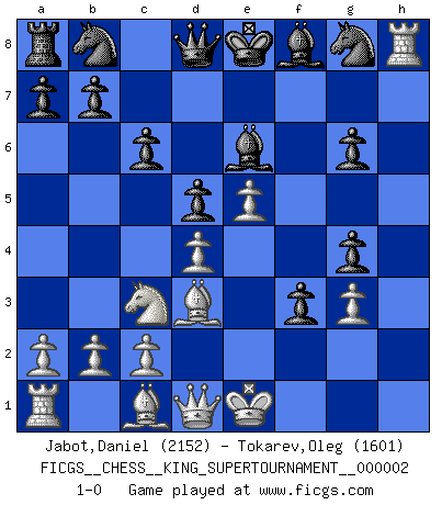 Last move : 1-0 2018 July 2 5:37:26 [Event "FICGS__CHESS__KING_SUPERTOURNAMENT__000002"] [Site "FICGS"] [Date "2018.05.01"] [Round "1"] [White "Jabot,Daniel"] [Black "Tokarev,Oleg"] [Result "1-0"] [WhiteElo "2152"] [BlackElo "1601"] 1.e4 e5 2.f4 exf4 3.Nf3 d6 4.d4 g5 5.h4 f6 6.Nc3 c6 7.hxg5 fxg5 8.e5 d5 9.g3 g4 10.Nh4 f3 11.Ng6 hxg6 12.Rxh8 Be6 13.Bd3 1-0 This chess game has been lost on time (started : 2018.05.01 22:10:15) KGA : Fischer defense Player White won this chess game. Follow this game move after move (download)In order to improve your game, you must study the endgame before everything else, for whereas the endings can be studied and mastered by themselves, the middle game and the opening must be studied in relation to the endgame. (Jose Raul Capablanca) Fischer: 'Remis!?' Uhlmann: 'Aber es muss doch dreimal Zugwiederholung sein!' Fischer: 'Sie nehmen das Remis an, wie ich es sage, sonst spiele ich weiter und werde Sie dann schlagen!' (Robert James Fischer) Jugadores de primera clase pierden en contra de jugadores de segunda clase porque los jugadores de segunda clase a veces juegan una partida de primer clase. (Siegbert Tarrasch) Il n'y a plus de joueurs du niveau de Jacob Murray dont la seule quête est le beau jeu, le plaisir de voir les pièces construire quelque chose. Sur 10 idées à la minute, 9 seront sans intérêt, la dernière s'avèrera géniale. (Christian Bauer) No enterprise is more likely to succeed than one concealed from the enemy until it is ripe for execution. (Niccolo Machiavelli)