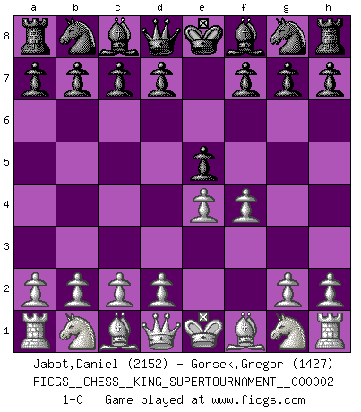 Last move : 1-0 2018 June 1 0:38:7 [Event "FICGS__CHESS__KING_SUPERTOURNAMENT__000002"] [Site "FICGS"] [Date "2018.05.01"] [Round "1"] [White "Jabot,Daniel"] [Black "Gorsek,Gregor"] [Result "1-0"] [WhiteElo "2152"] [BlackElo "1427"] 1.e4 e5 2.f4 1-0 This chess game has been lost on time (started : 2018.05.01 22:10:15) King's gambit Player White won this chess game. Follow this game move after move (download)Adequate compensation for a sacrifice is having a sound combination leading to a winning position; adequate compensation for a blunder is having your opponent snatch defeat from the jaws of victory. (Bruce A. Moon) Sehr viele beherrschen heutzutage das große Einmalseins des Schachspiels und kennen sogar dessen Logarithmentafeln auswendig - deshalb sollte man hin und wieder zu beweisen trachten, dass zwei mal zwei auch fünf sein kann. (Mikhail Nekhemyevich Tal) Tu eres para mi la Reina en d8 y yo soy el Peón en d7!!. (GM Eduard Gufeld) Le joueur d'Echecs qui veut atteindre le top est obligé de développer son propre credo créatif. Alexeï Stepanovicth Souétine. Il est facile d'écrire des livres ! Ce qui est difficile, c'est de jouer ! (Alexeï Stepanovicth Souétine) The only difference between a tax man and a taxidermist is that the taxidermist leaves the skin. (Mark Twain)